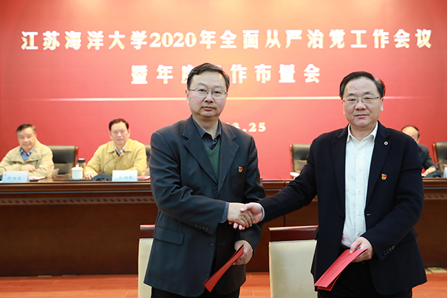 宁晓明就做好学校2020年度工作,提出四点要求。一要突出主要矛盾,着力聚焦年度重点工作。要把学校党委确定的八项重中之重工作,作为本单位、本部门的头等大事来抓好、抓实、抓到位。同时,当前要做好新冠肺炎疫情防控工作,精准掌握师生动态,切实维护校园秩序和做好应急预案。二要突出从严从实,着力提高党建工作水平。要认真贯彻新时代党的建设总要求,以落实全面从严治党责任清单为抓手,持续推进党的各方面建设,不断提升党建工作质量。三要突出内涵建设,着力提升学校发展质量。在人才培养方面,持续深化教育教学改革,制定江苏海洋大学本科教育发展“十四五”规划。在学科建设方面,加强优势学科和重点学科建设,对标学科评估指标,全力提升学科竞争力。在师资队伍方面,深入推进人事制度改革,构建符合各类人才特点的教师职业发展体系。在科学研究方面,完善科研论文奖励办法,积极培育高水平科研成果。四要突出问题导向,着力加强内部治理能力。要在全面回顾和系统总结“十三五”规划的基础上,谋划制定《江苏海洋大学“十四五”事业发展规划》。要完善综合考核办法,制定《江苏海洋大学综合考核实施办法》,推动精细化管理,提升支撑服务能力。