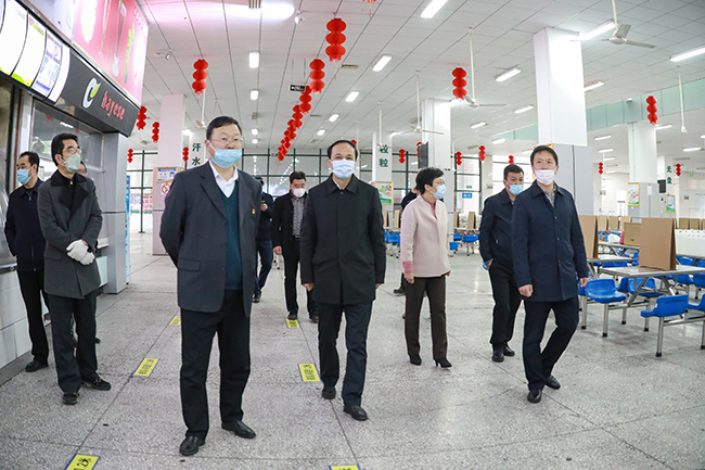 黄远征副市长一行重点查看了我校防控物资储备仓库、学生食堂、医学隔离观察场所。在检查过程中,黄远征对我校疫情防控和开学准备工作表示满意。随后,在我校会议中心召开了学校疫情防控和开学准备工作座谈会,黄远征副市长一行认真听取了我校疫情防控和开学准备工作情况汇报,并就学校进一步加强应急处置、防控物资保障、校园安全管理、学生返校、涉外防控、师生心理疏导等方面的工作给予指导。黄远征充分肯定了学校疫情防控前期工作和开学准备工作,他指出,学校是人员密集场所,师生众多,疫情防控责任大、任务重,防控工作要做到无纰漏,确保万无一失。