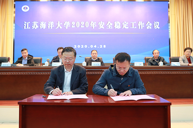 校长宁晓明代表学校与二级单位(部门)代表签订2020年安全稳定管理工作责任书,后勤管理处处长、饮食服务总公司总经理马恒通,药学院党总支书记孙涛,分别代表机关和教辅单位、学院上台签订责任书。