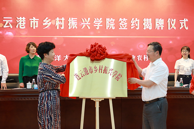 在主席台领导下的见证下,连云港市农业农村局局长毛太乐和我校法律与公共管理学院院长吴价宝作为双方代表签订了合作协议。在阵阵掌声中,吴海云和宁晓明为乡村振兴学院揭牌。
