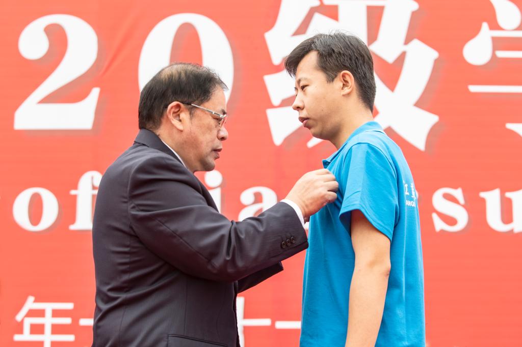 校党委书记王自力为新生代表佩戴校徽。戴上校徽,你就是海大人,要扛起海大人的责任。