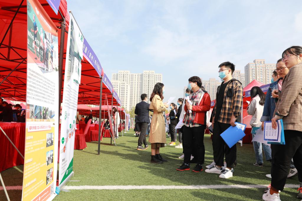 10月17日,江苏省“服务发展促就业”(医药卫生)类暨江苏海洋大学2021届毕业生招聘会在我校苍梧校区东体育场隆重举行。本次招聘会由江苏省高校招生就业指导中心、连云港市人才服务中心及江苏海洋大学招生与就业处共同主办。来自全国各省的315家企业单位和我校2021届毕业生参与本次招聘会。