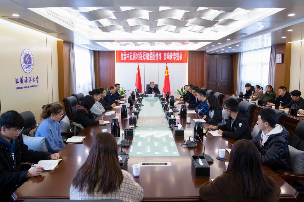 11月4日下午,我校“党委书记面对面”座谈会在行政楼五楼会议室举行。学校党委书记王自力教授与学生党员代表围绕“厚植爱国情怀,奏响青春赞歌”这一主题进行了深入交流。学校党委常委、宣传部部长杨雪英,党委办公室、校长办公室主任郑利军,海洋科学与水产学院党委书记王波,海洋工程学院党委书记唐正康等参会。会议由王波主持。