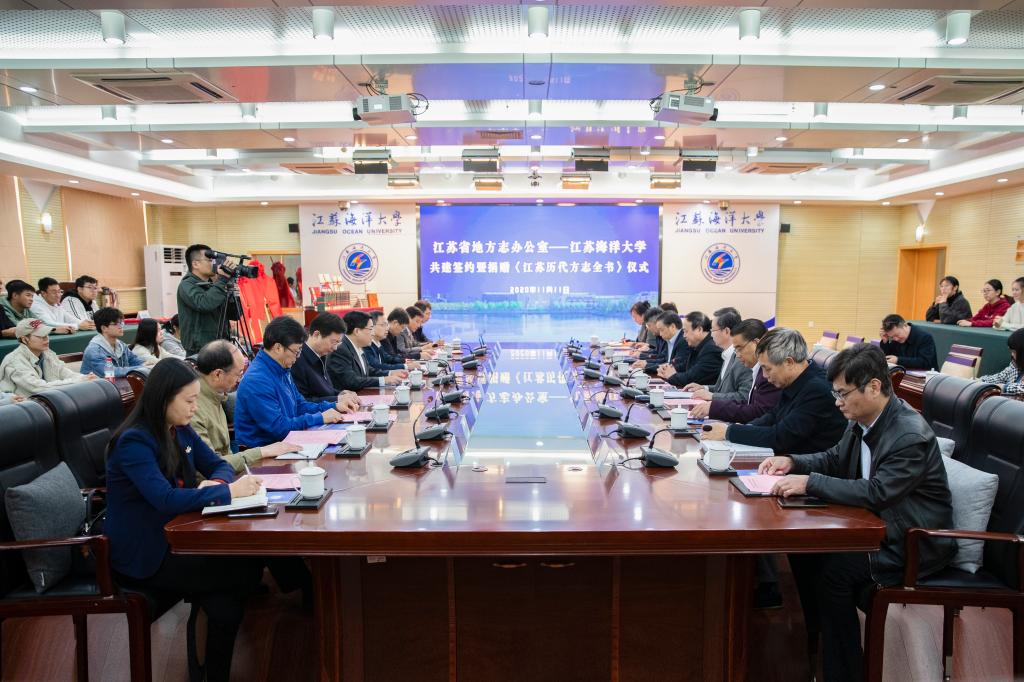 双方代表签署了战略合作框架协议,将在地方志学科建设、理论研究、资源开发利用、方志文化推广等方面深化战略合作。为充分发挥双方学术人才和学术资源优势,省地方志办公室、江苏海洋大学、江苏新闻广播联合推出“海上丝绸之路江苏寻迹”专栏,省地方志办公室与江苏海洋大学合作共建“江苏海洋文化研究院”,联合开展海洋文化类课题项目研究,承接相关部门关于海洋强省建设等方面的项目。“江苏海洋大学海洋经济文化研究中心”加入“江苏省方志馆联盟”,共同打造区域特色文化品牌。左健伟、宁晓明共同为“江苏海洋文化研究院”和“江苏省方志馆联盟”揭牌。