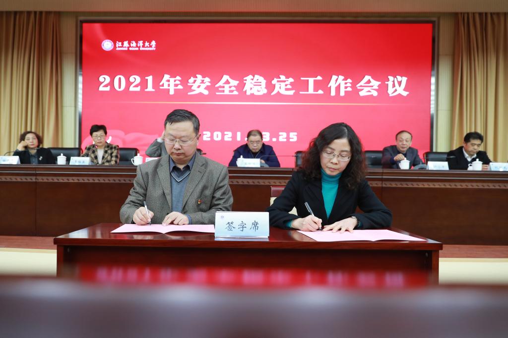校长宁晓明代表学校与二级单位(部门)签订2021年安全稳定工作责任书,设备与实验室管理处处长刘玮炜、海洋技术与测绘学院院长焦明连,分别代表机关和教辅单位、学院上台签订责任书。