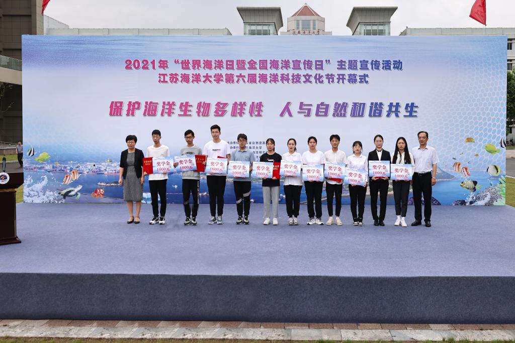 副校长李梅英宣读《江苏海洋大学2021年海洋日特别奖学金表彰决定》,并与赵钧巡视员一起为11位品学兼优的同学颁发奖牌和证书。