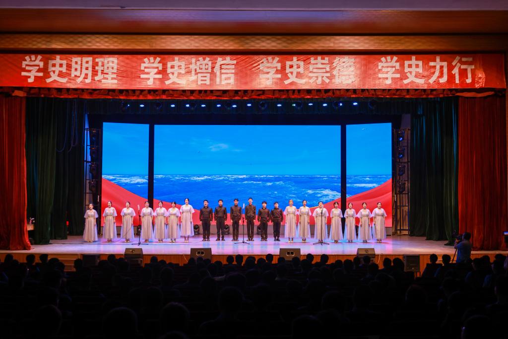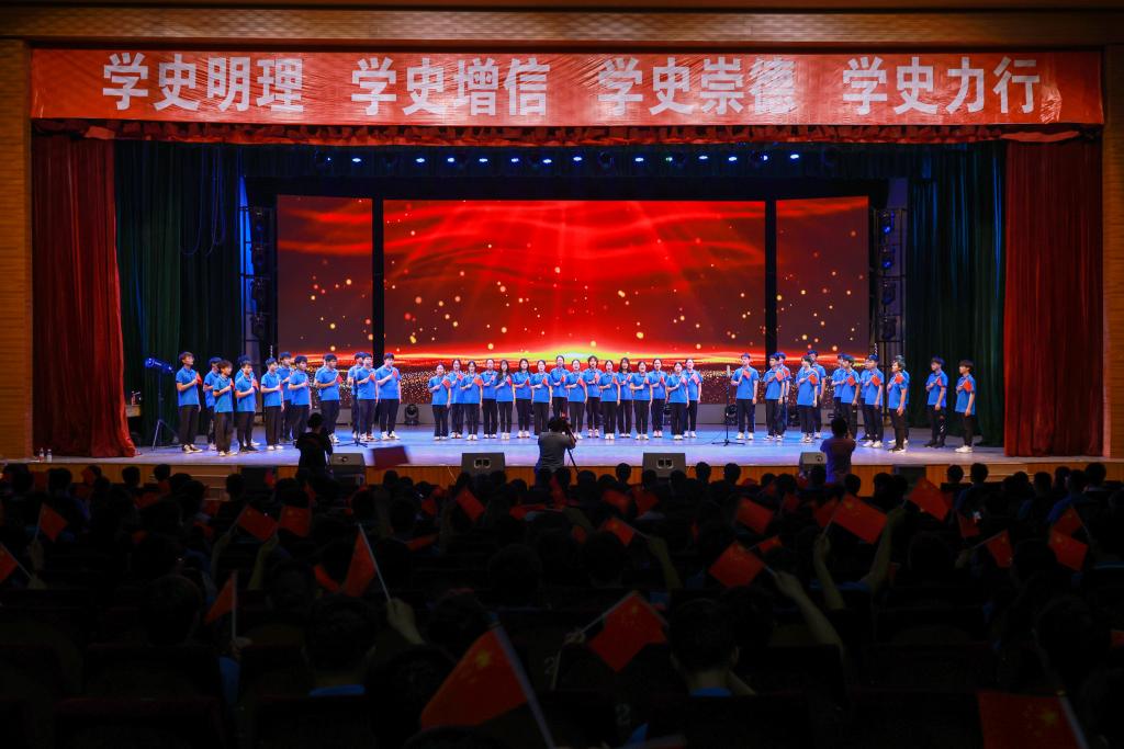 下午2时30分,上课铃声响起。《唱支山歌给党听》《没有共产党,就没有新中国》两首快闪歌曲联唱拉开了百年党史青春说江苏海洋大学站活动的序幕。闪亮的党徽、挥动的国旗、年轻的脸庞、动听的歌曲,瞬间点燃了整个会场的气氛。