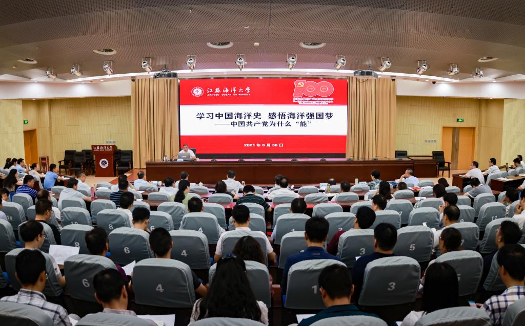 6月30日上午,按照校党委党史学习教育部署要求,校党委书记王自力在会议中心黄海厅,讲授题为“学习中国海洋史 感悟海洋强国梦”专题党课,全体校领导、全体中层干部、“双带头人”代表、党外人士代表等220余人聆听了党课。