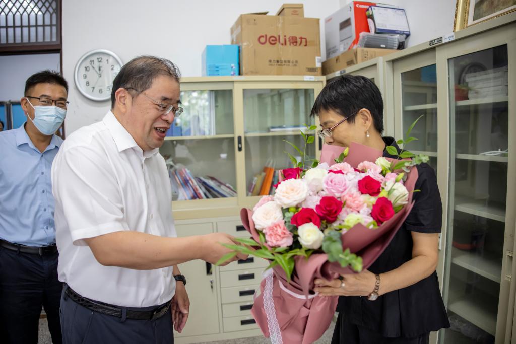 校领导先后到刘娟、王学松、钟思华、蒋莹莹、贾东宝、孙颖颖、张君来、谈全彬的办公室或家中,为他们送上鲜花和慰问金。校领导每到一处,都详细了解教师代表们的身体状况、家庭情况、教学科研进展等,认真听取他们对学校建设发展的建议。