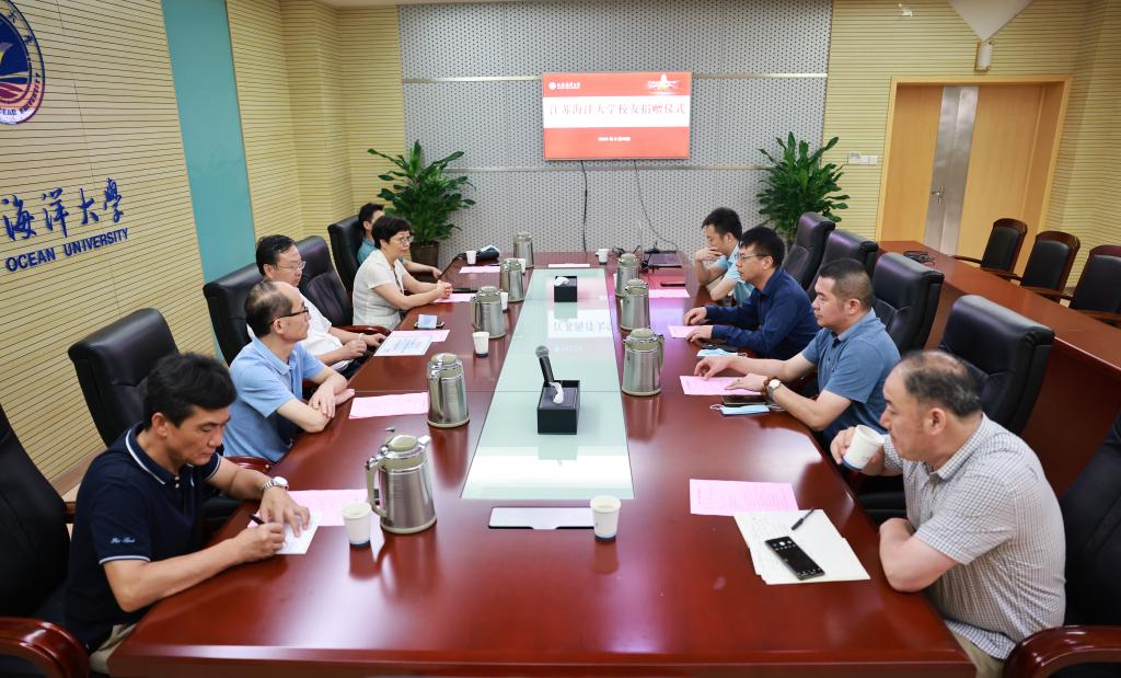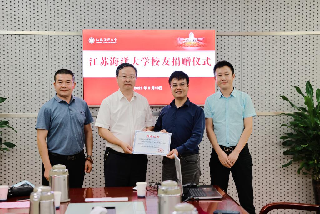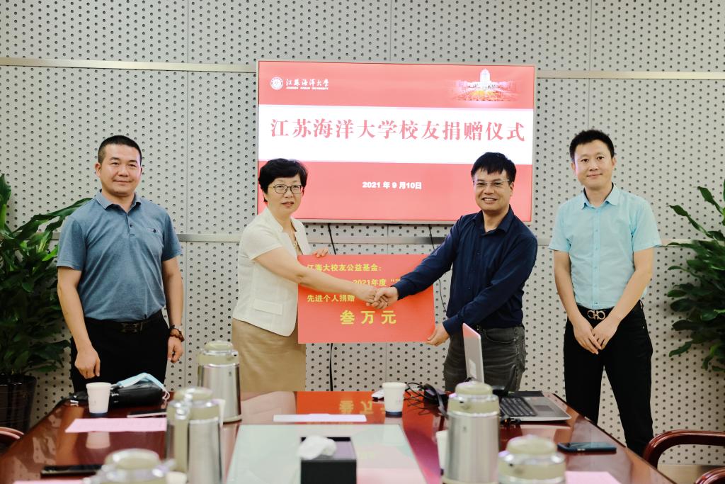 本次捐赠是由梅锦方、左元宏、张志忠等校友发起的江苏海洋大学校友公益基金向学校进行的定向捐赠,今年是捐赠的第二年,捐赠款项用于奖励表彰“三育人”先进个人。宁晓明代表学校向校友颁发捐赠证书,李梅英代表学校接受校友捐赠。