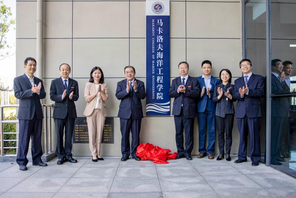 校党委书记王自力和校长宁晓明为江苏海洋大学马卡洛夫海洋工程学院揭牌。全体与会人员与第一届马卡洛夫海洋工程学院全体学生合影留念。