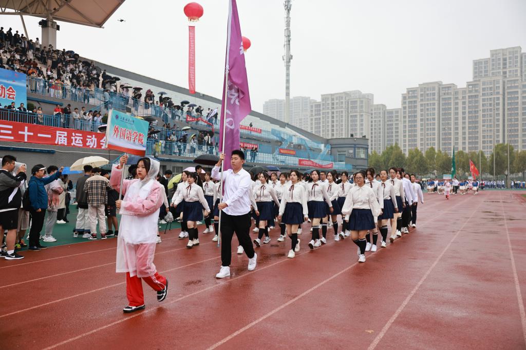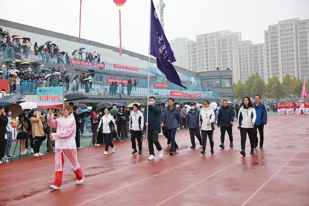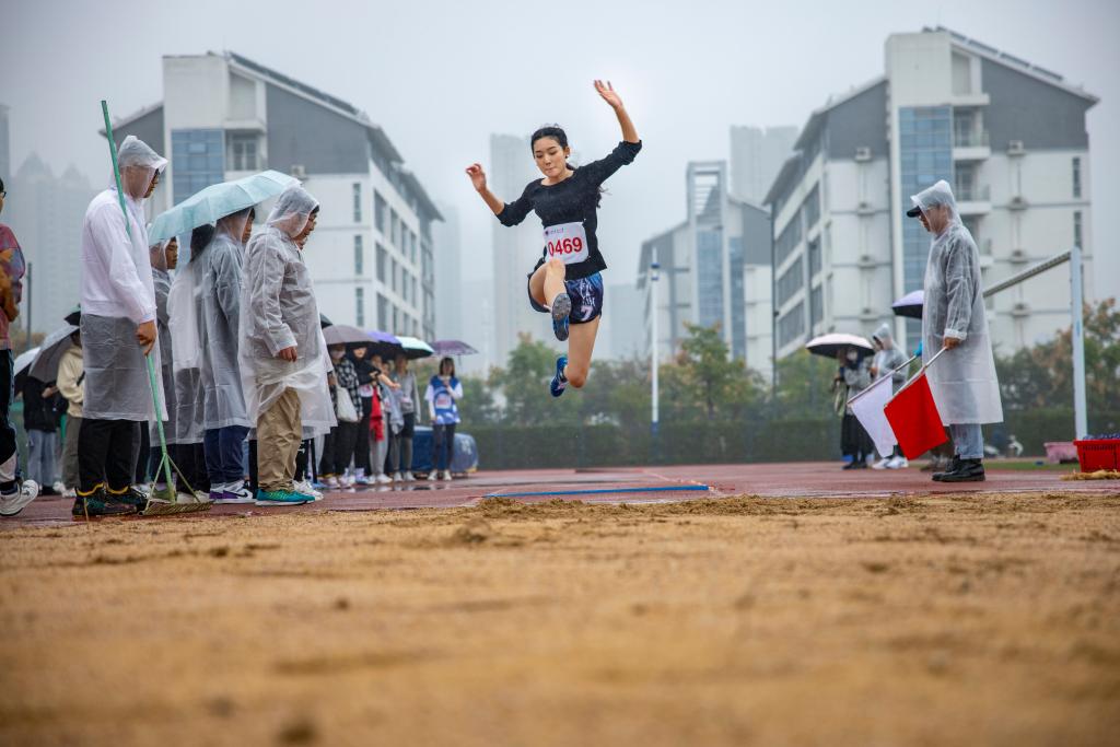 田径操场上,运动员们奋勇拼搏,敢于争先,趣味运动项目中,运动员们团结协作,互帮互助。数十位裁判员和工作人员不畏寒风细雨,身披雨衣,助力运动会比赛井然有序地开展。
