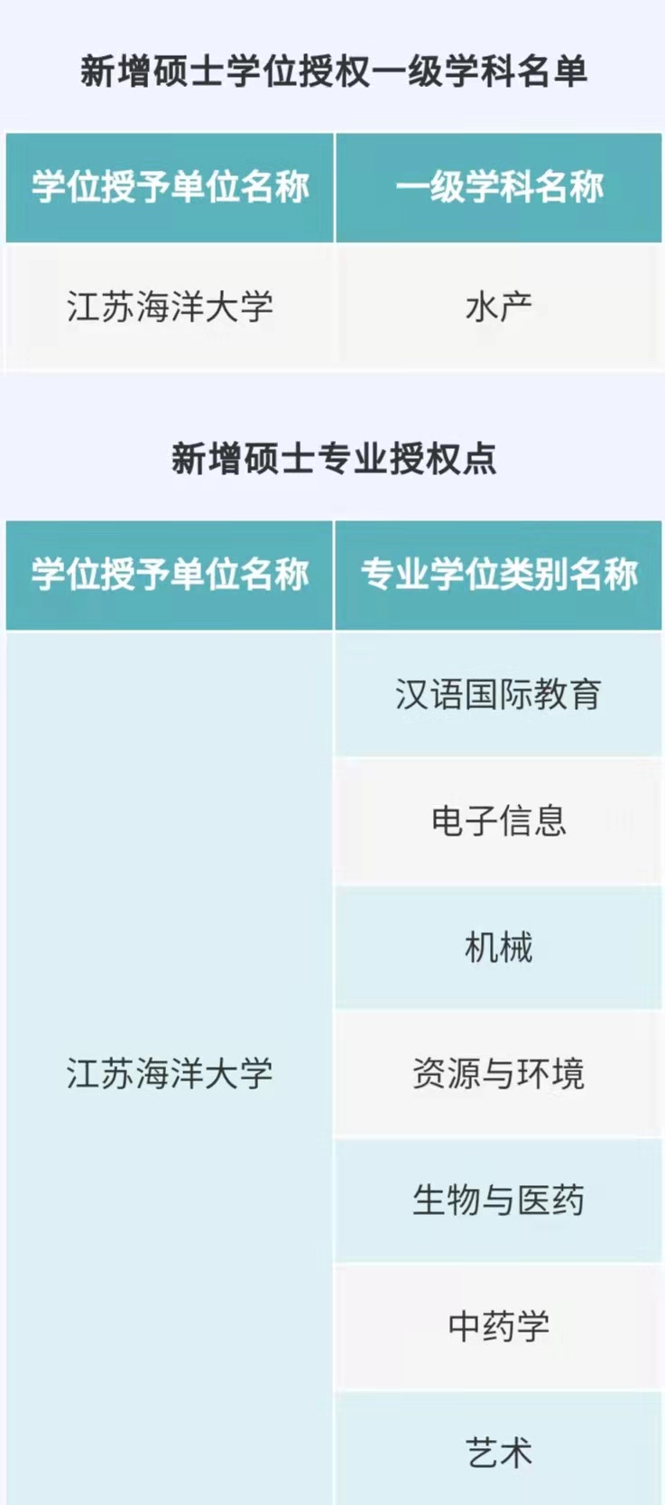 近日,国务院学位委员会发布了《关于下达2020年审核增列的博士、硕士学位授权点名单的通知》(学位[2021]14号),经国务院学位委员会审议批准,我校获批水产一级学科硕士学位授权点,汉语国际教育、电子信息、机械、资源与环境、生物与医药、中药学、艺术7个专业硕士学位授权点。