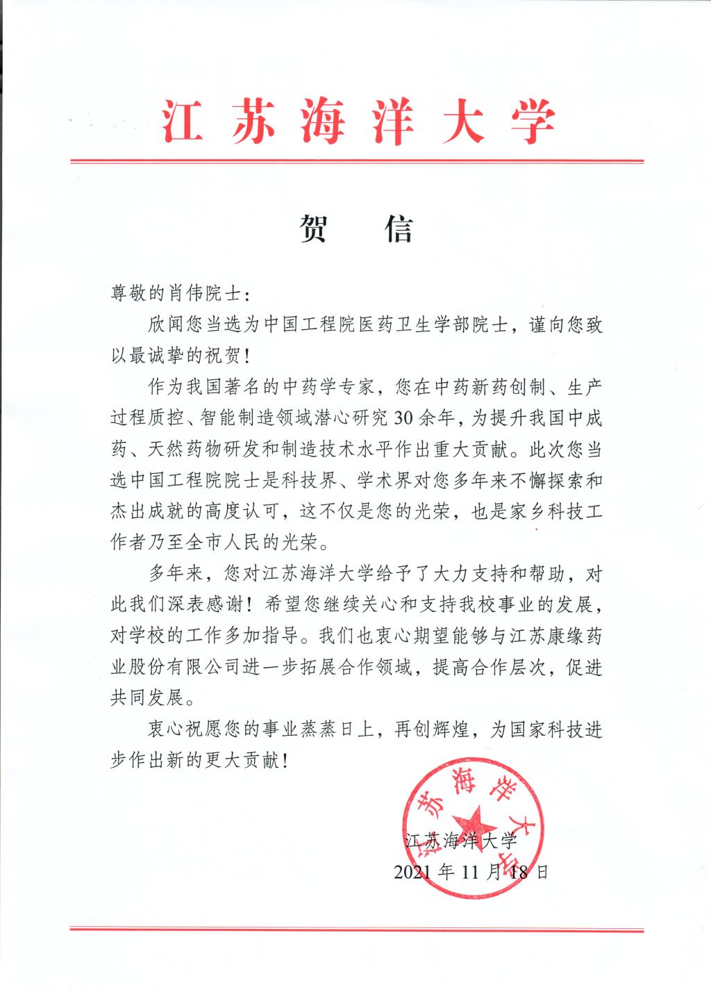 宁晓明向肖伟董事长当选中国工程院院士表示热烈地祝贺,并对肖院士长期以来关心支持江苏海洋大学的发展表示衷心的感谢。他详细介绍了近年来学校在人才培养、科学研究、师资队伍和社会服务等方面取得的发展成效,以及学校在“十四五”期间的发展目标和主要任务。他指出,“十四五”期间,学校的首要任务就是全力推进博士学位授予单位创建工作,希望肖院士一如既往地关心和支持学校发展,加快推进学校与康缘药业有限公司联合建设院士工作站,进一步深化双方合作,促进共同发展。