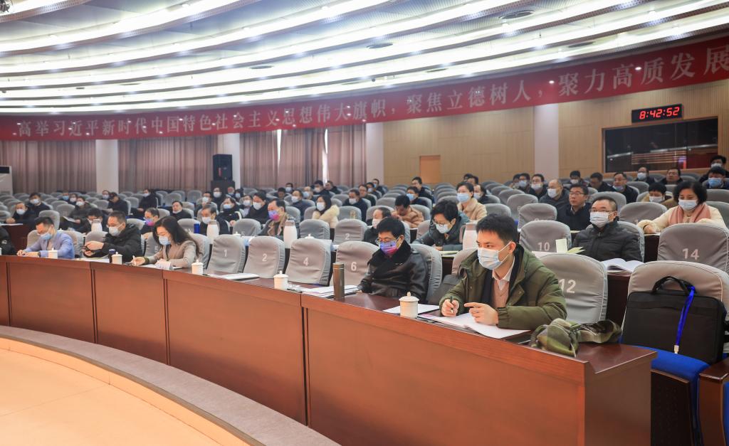 宁晓明代表校行政班子作述职报告,报告从“坚持立德树人,人才培养质量持续提升”“坚持目标引领,不断提升学科建设内涵”“坚持创新驱动,不断提高科学研究水平”“坚持人才强校,师资队伍水平持续提高”“坚持学生中心,学生教育管理稳步加强”“坚持激发活力,内部管理改革持续深化”六个方面,全面回顾了学校行政在2021年聚焦内涵建设,全面推进学校事业发展的主要工作情况。