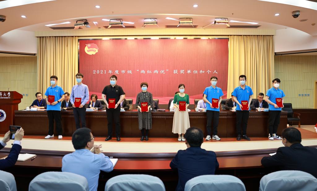 党委组织部部长纪延光宣读了省、市级“两红两优”表彰单位和个人。我校2个团支部获得省级、市级五四红旗团支部;1个学院团委被评为市五四红旗团委;8名师生荣获省级、市级优秀团员、优秀团干部。