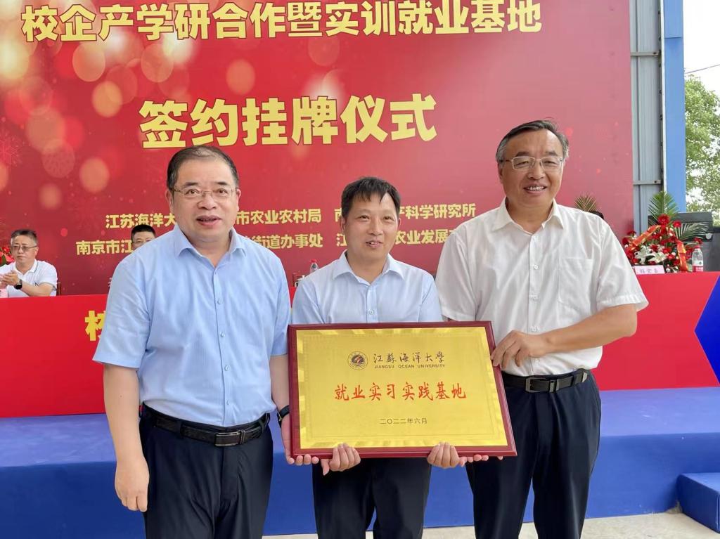 ▲ 在江苏坤泰公司养殖基地,副校长朱国军与公司总经理、校友姜伟签订产学研合作暨实训就业基地协议。校党委书记王自力与江苏省农业农村厅一级巡视员沈毅共同为基地授牌。
