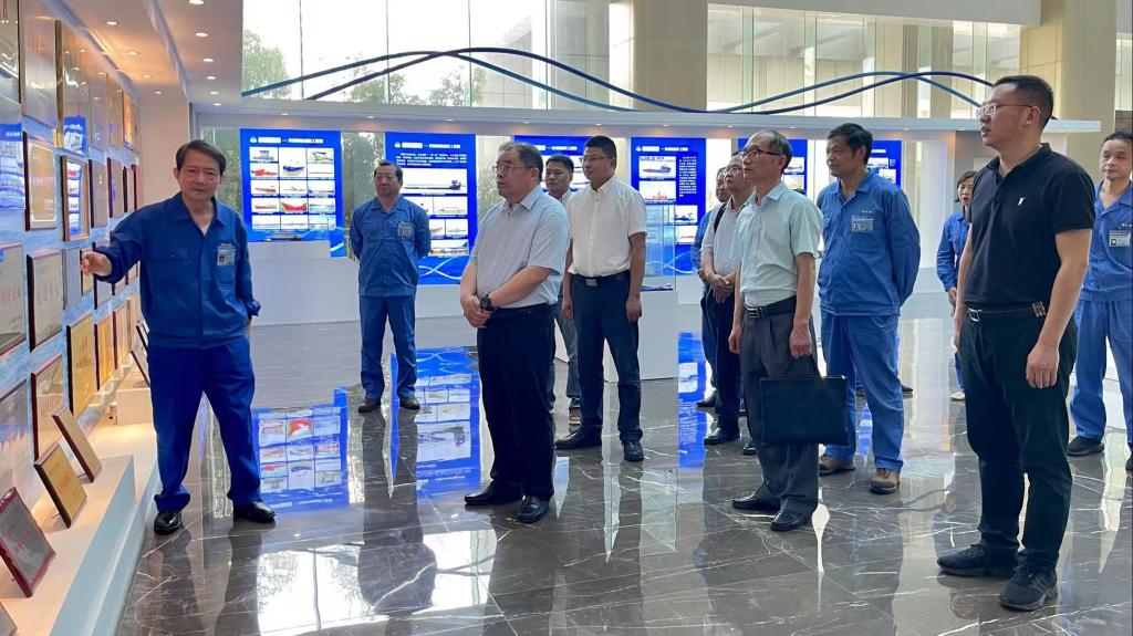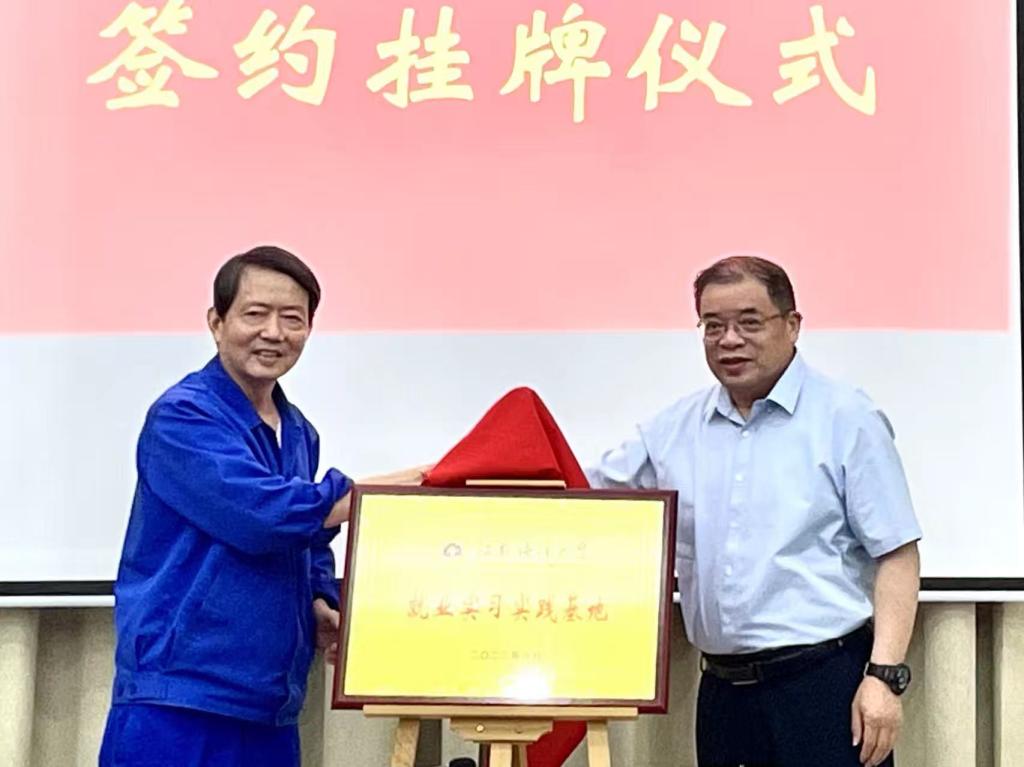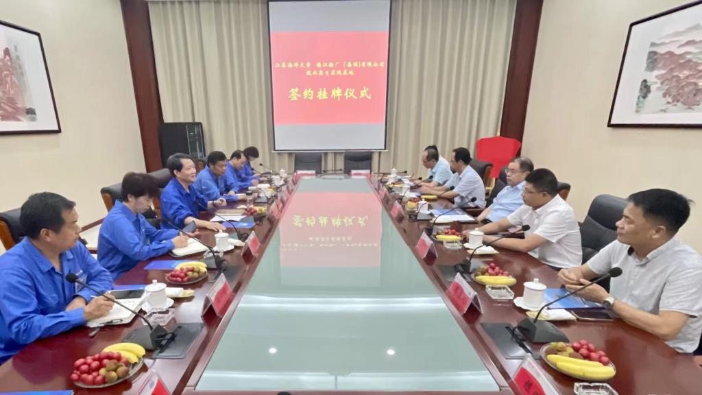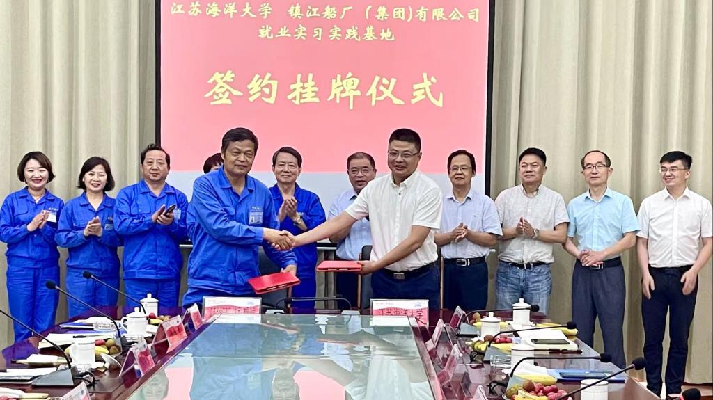 ▲ 在江苏省镇江船厂集团有限公司产品展厅,董事长郭琰如数家珍地介绍企业在特种工程船舶领域创造的多个“全国第一”。集团公司总经理张言才和江苏海洋大学副校长朱国军代表双方签订了合作协议,王自力和郭琰共同为就业实习实践基地揭牌。