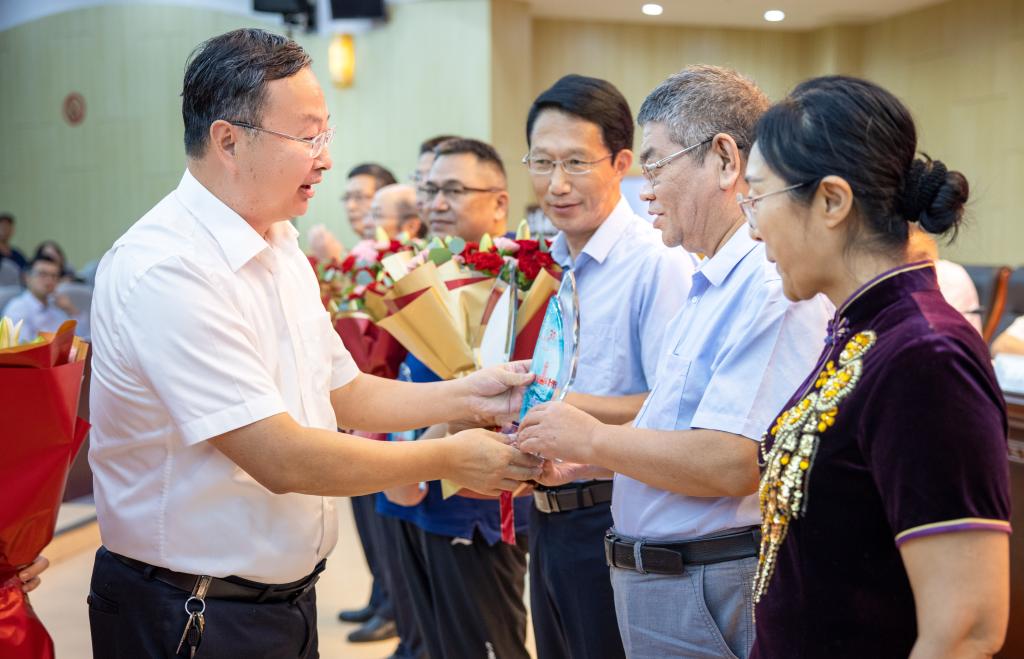 校长宁晓明向李树安、施珺、杜云建、张珍明、周渊深、卢龙、胡杰、丁克会、周立、王洪斌、徐汉清、张海涛、黄伟业、申屠留芳、邓中良、吕汇、周桂芹、商思争、张滦云等19位从教满30周年的教师代表颁发荣誉纪念品并送鲜花,对学校156名第一批从教30年荣誉获得者三十载默默耕耘,用爱心与奉献书写教育情怀,用责任和担当助力学校发展,致以崇高的敬意和衷心感谢。