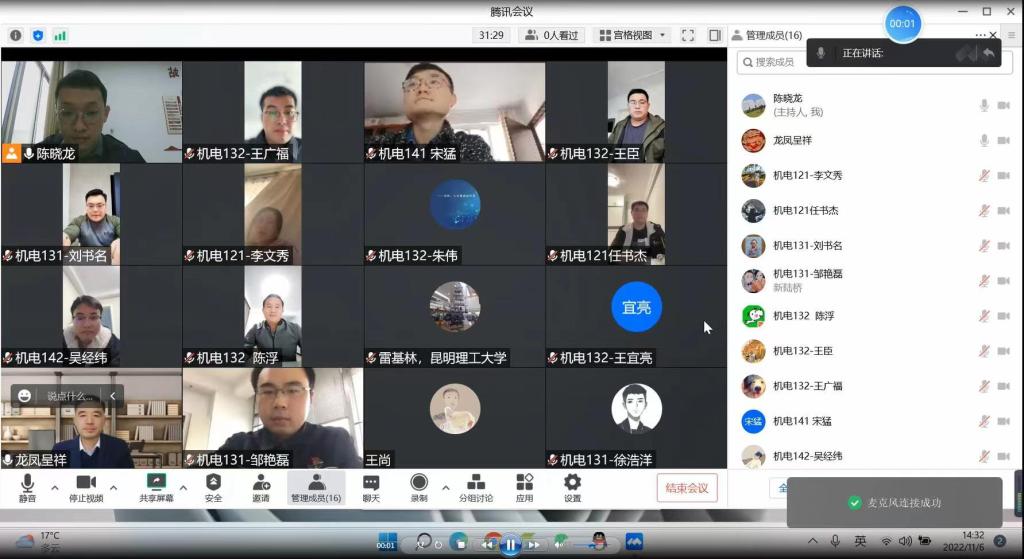 11月6-8日,受教育部教育质量评估中心和中国工程教育专业认证协会委派,由西南交通大学董大伟教授任组长,中国机械工程学会罗平教授级高工、江苏大学任乃飞教授、西安科技大学张旭辉教授、昆明理工大学雷基林教授及认证秘书内蒙古科技大学陈星老师6人组成的中国工程教育专业认证专家组,以线上方式对我校机械电子工程专业开展现场考查。校长宁晓明、副校长严云洋出席现场考查专家见面会及意见反馈会。