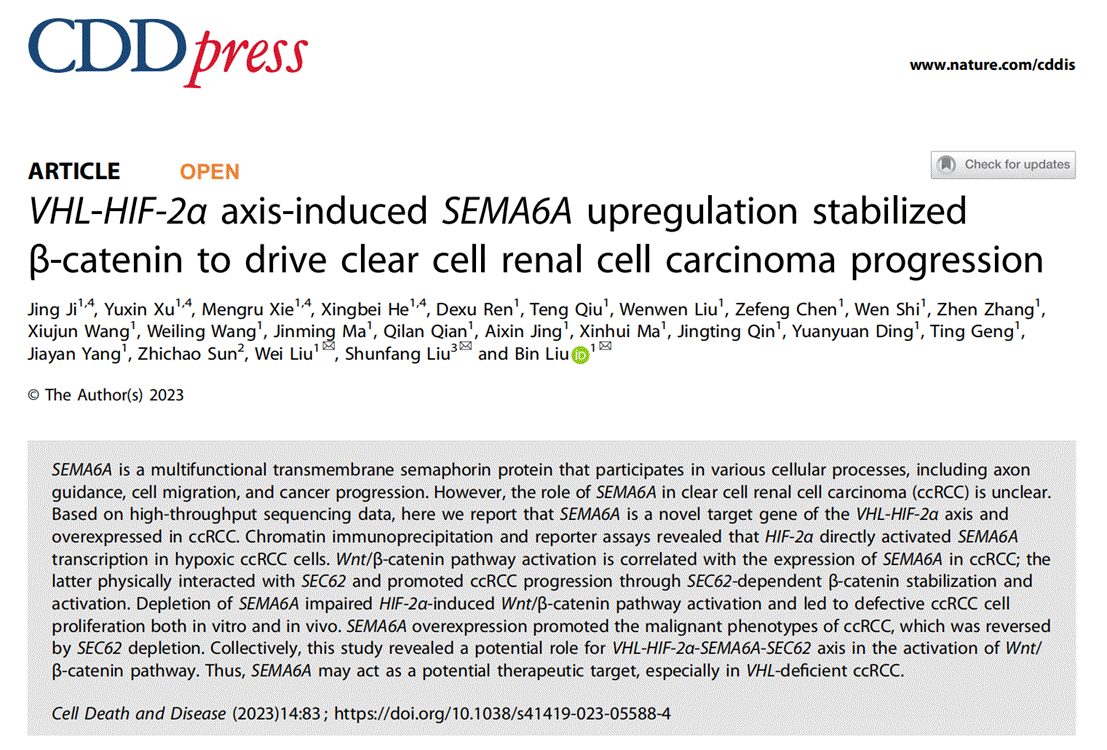 2月4日,江苏海洋大学药学院的刘彬&吉敬课题组在Nature(《自然》)子刊Cell Death and Disease(中科院1区,TOP期刊)上发表了题为“VHL-HIF-2α axis-induced SEMA6A upregulation stabilized β-catenin to drive clear cell renal cell carcinoma progression”的研究论文。该研究首次发现了肾透明细胞癌中VHL-HIF-2α轴的靶基因SEMA6A,并通过多种技术手段深入探究了SEMA6A在肾透明细胞癌中的重要作用及相关分子机制。这项研究为肾透明细胞癌的治疗提供了新的重要靶点。该文第一作者是江苏海洋大学药学院的吉敬副教授,刘彬教授、刘伟教授为共同通讯作者,江苏海洋大学是该文的第一完成单位(图1)。