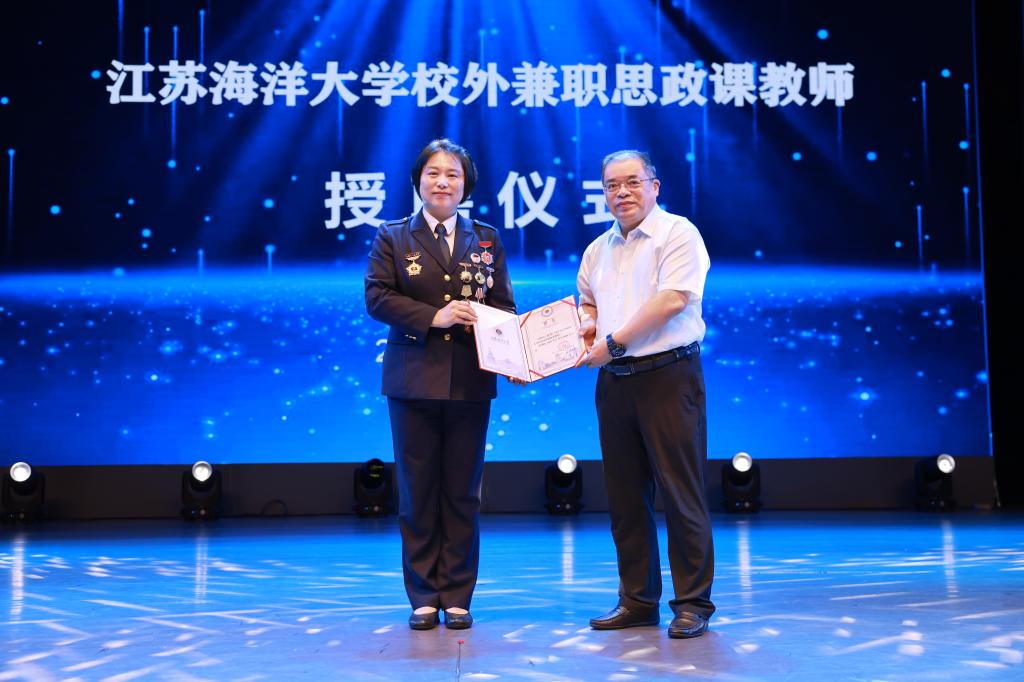 校党委书记王自力为徐玲颁发“校外兼职思政课教师”聘书。主持人穿插了寓教于乐的海洋知识问答,现场气氛活跃。