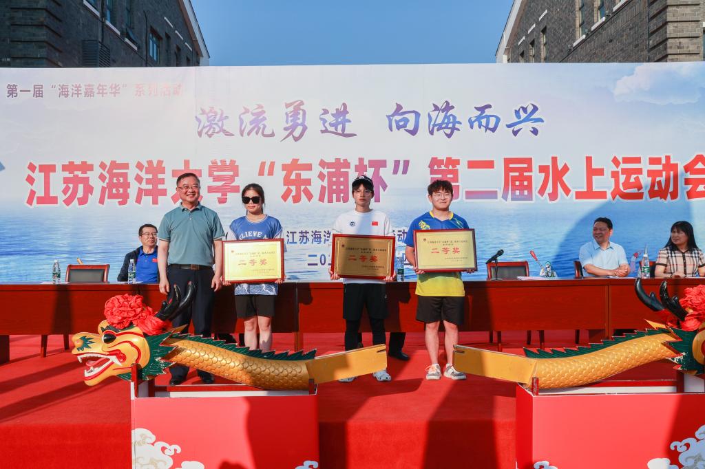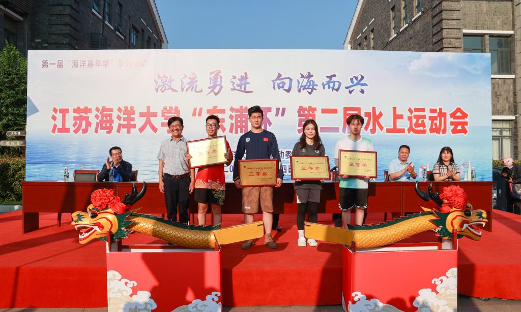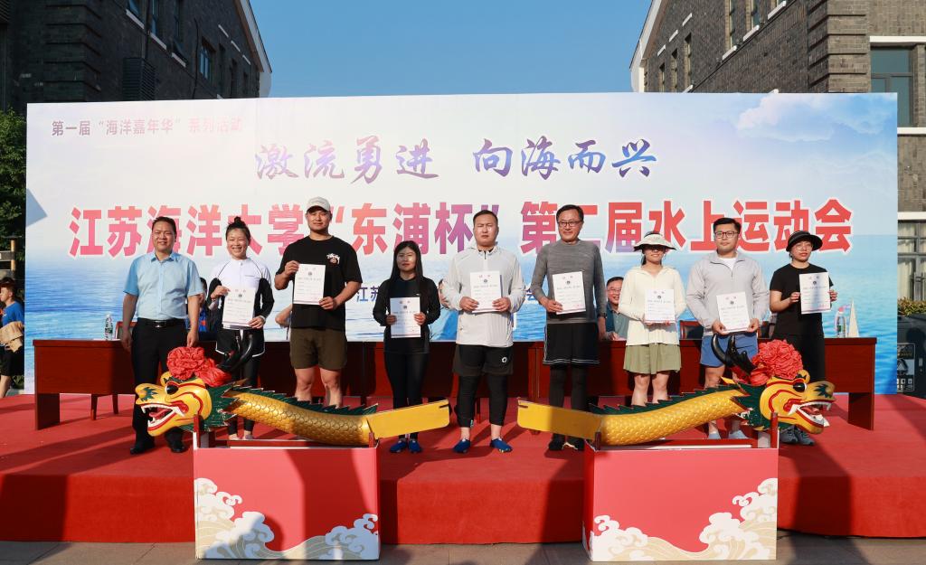 校党委书记王自力和江苏东浦管桩有限公司党委书记谭学立为龙舟点睛,校长宁晓明宣布比赛开始。经过激烈角逐,环境与化学工程学院荣获龙舟赛一等奖,应用技术学院、电子工程学院、海洋科学与水产学院荣获二等奖获,土木与港海工程学院、理学院、药学院、文法学院荣获三等奖,其他单位获得优胜奖。应用技术学院的陶垠旭获得学生组皮划艇单人艇第一名;马卡洛夫海洋工程学院的徐艺萌、王孜恒获得学生组皮划艇混合双人艇第一名;应用技术学院的崔晓琳、许华娣获得教工组皮划艇混合双人艇第一名。