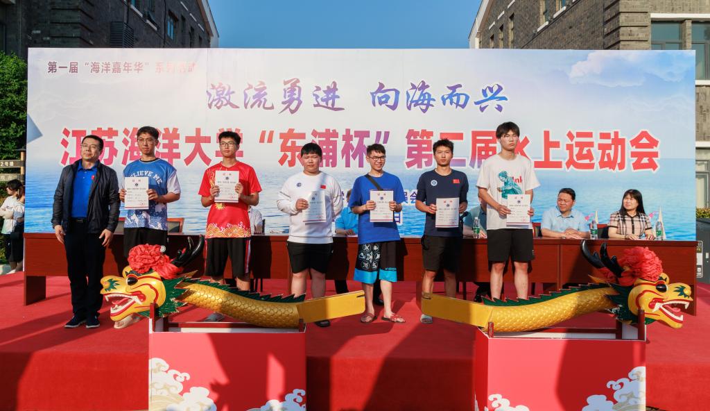 校党委书记王自力为龙舟争霸赛一等奖获奖单位颁奖并授予“霸主旗”。“激流勇进 向海而兴”东浦杯第二届水上运动会也是我校第一届海洋嘉年华系列活动之一,现场展示了习近平论海洋强国宣传展板,让广大师生关注海洋事业发展,提升保护海洋资源,关爱海洋生态环境意识。