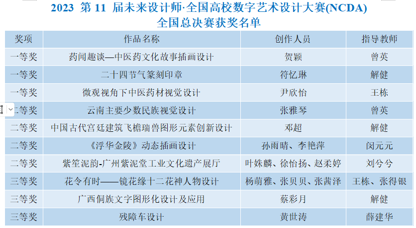 2023年我校艺术设计学院组织参赛,获国家级一等奖1项、二等奖3项、三等奖8项。