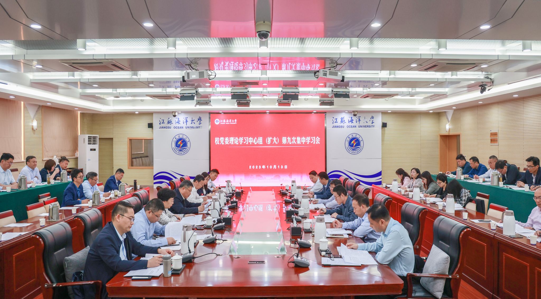 10月13日上午,学校在会议中心东海厅召开校党委理论学习中心组(扩大)学习会。重点学习了习近平总书记最新重要讲话、重要指示、重要回信精神以及江苏省政府关于建设海洋强省有关政策精神等内容。校党委书记许峰主持会议,在连校领导、“两委”委员、党群部门负责人、二级党组织书记参加学习会。