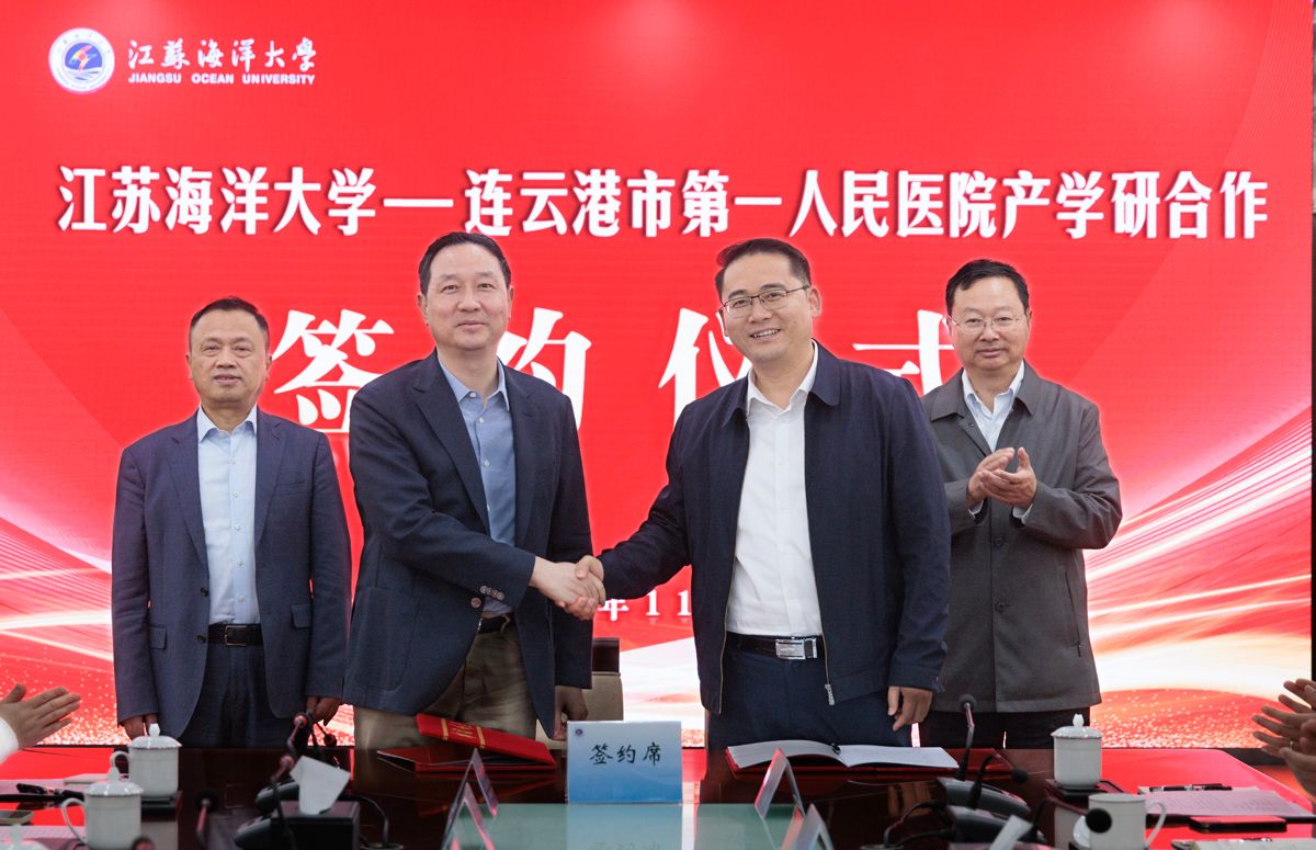 连云港市第一人民医院院长施辉、我校副校长申欣代表双方,在连云港市第一人民医院党委书记李爱民、我校校长宁晓明的共同见证下,现场签订江苏海洋大学-连云港市第一人民医院产学研合作协议。