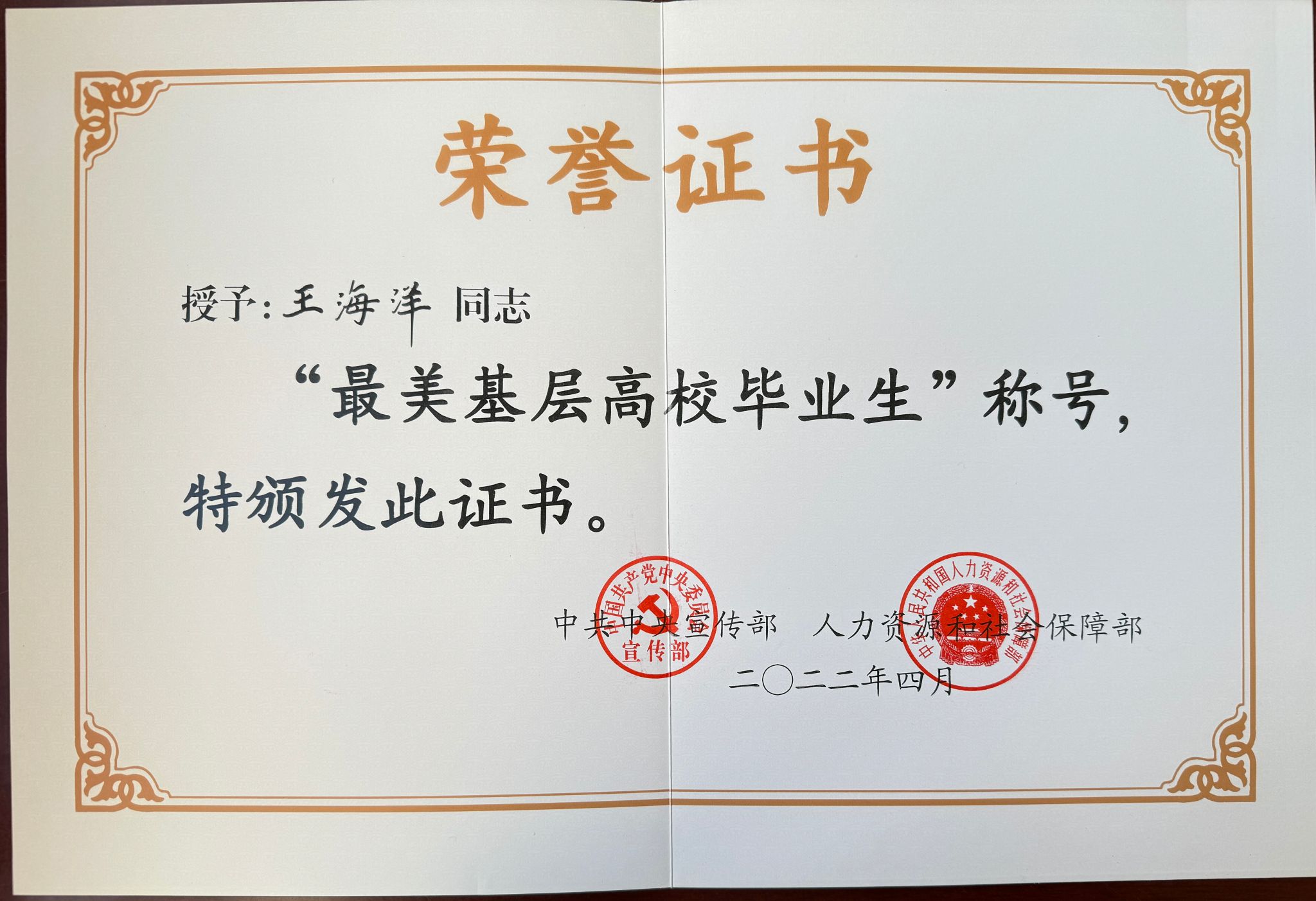 “最美基层高校毕业生”证书(校友王海洋捐赠)