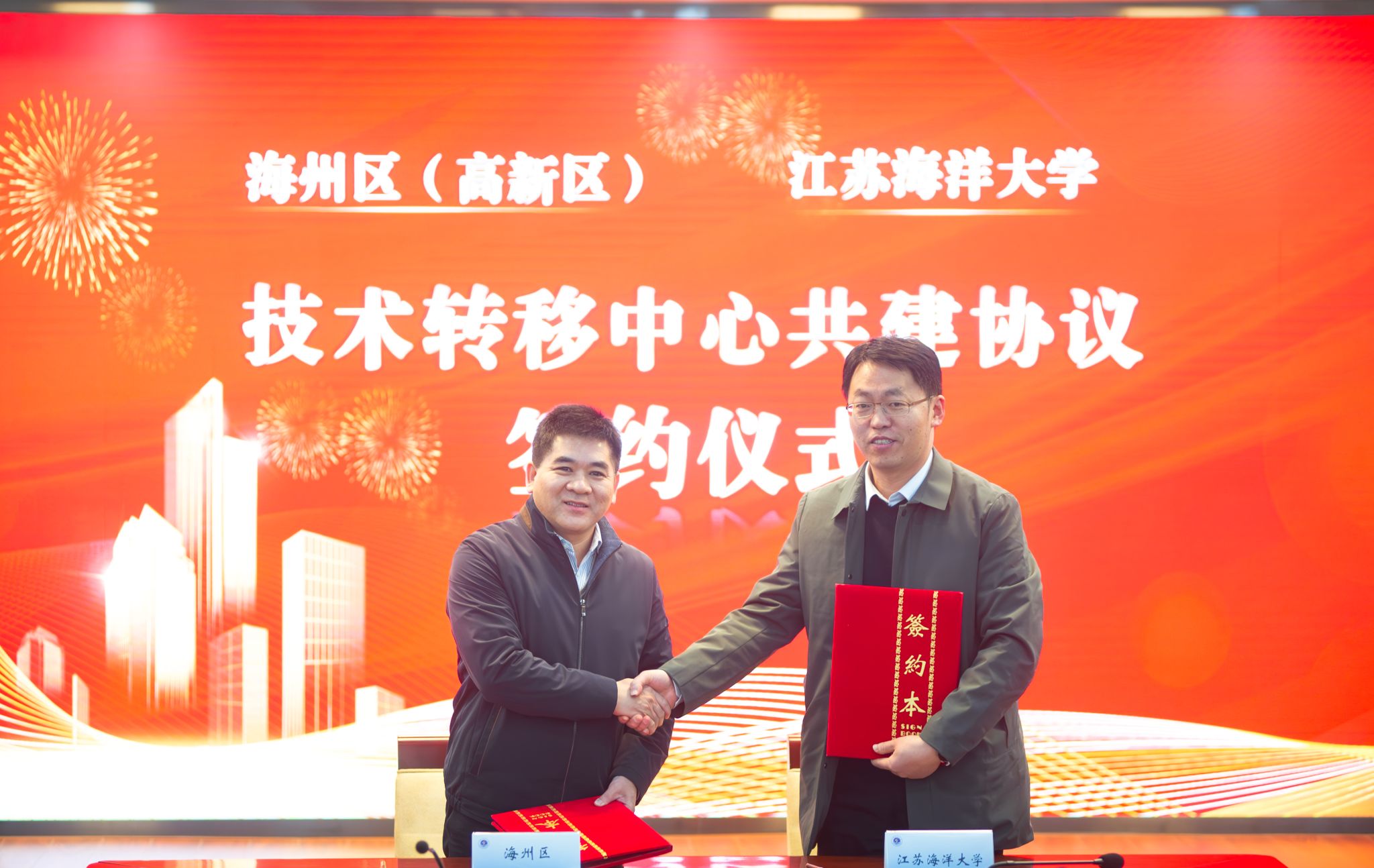海州区科技局局长,高新区科经局局长黄文传和我校科学技术处处长戴红伟代表双方签订《海州区科学技术局―江苏海洋大学联合技术转移中心共建协议》。