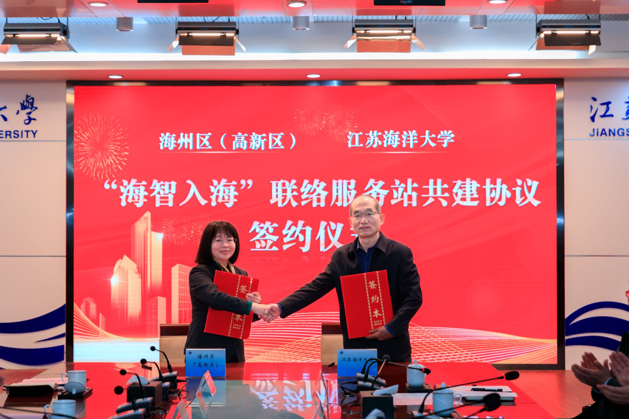 海州区人力资源和社会保障局局长董志红和我校招生与就业处处长马恒通代表双方签订《海州区人力资源和社会保障局―江苏海洋大学“海智入海”人才联络服务站共建协议》。