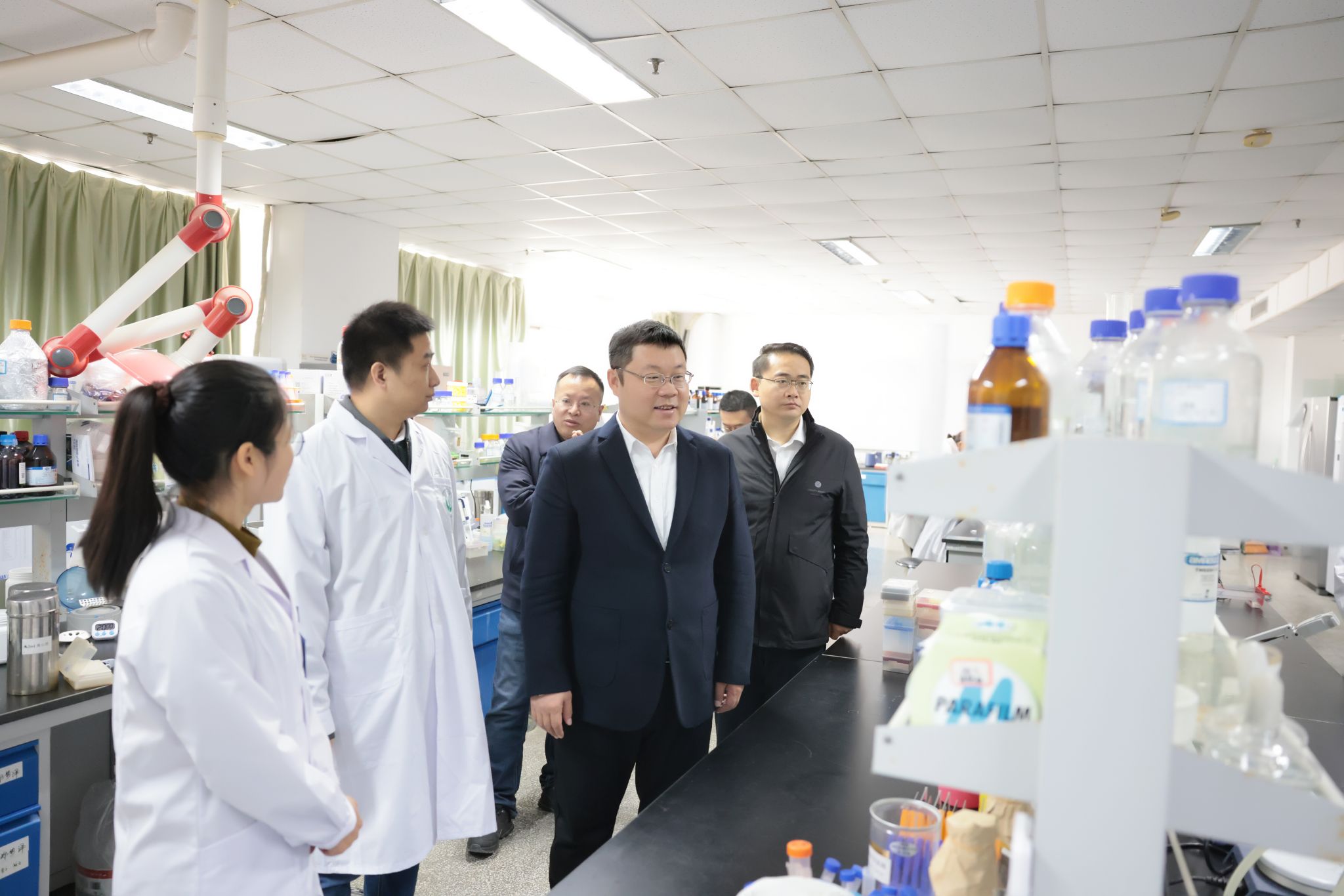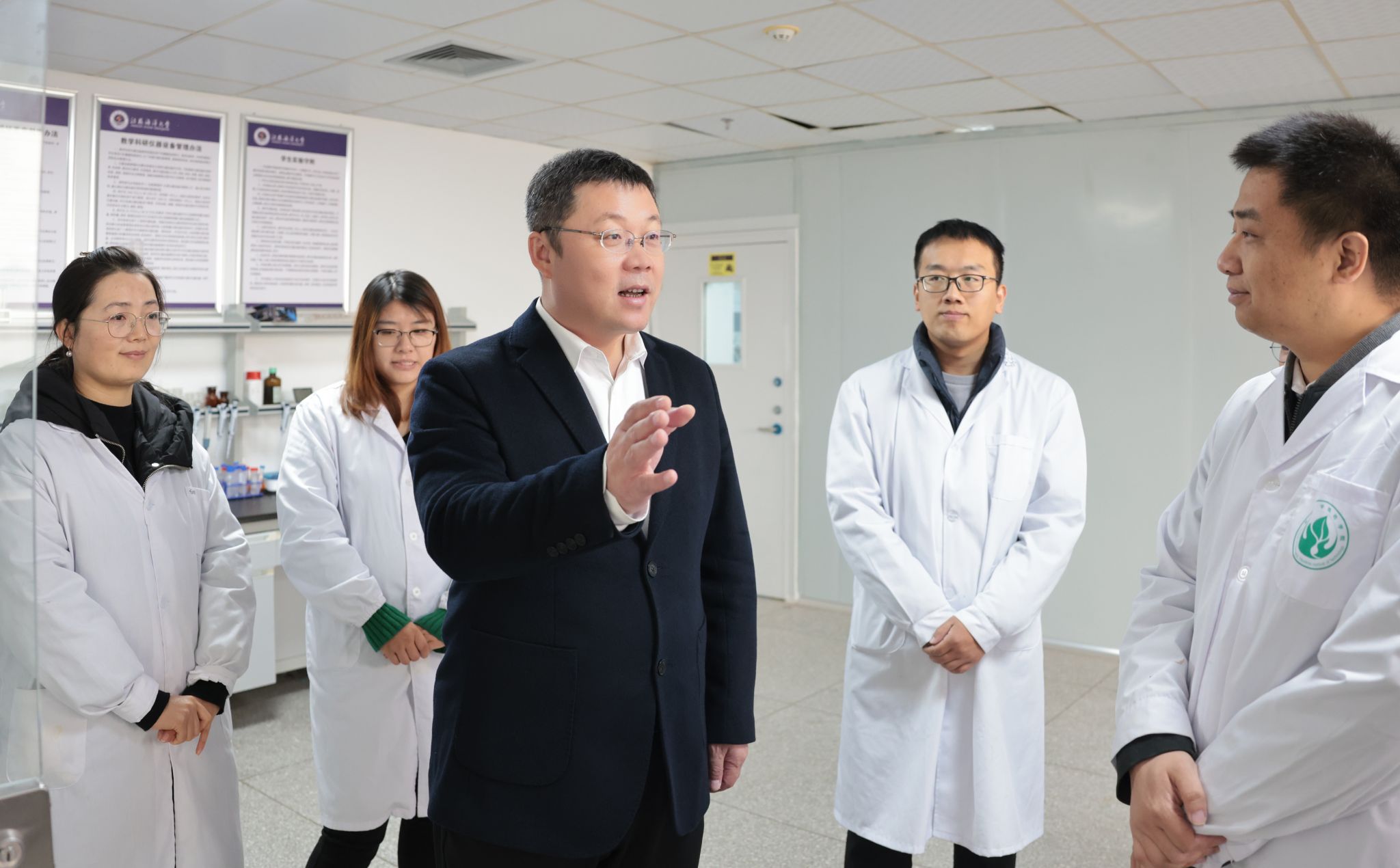 许峰听取了江苏省海洋资源开发研究院建设发展情况汇报,参观了海洋产业体系成果展厅,走访了江苏省海洋药物活性分子筛选重点实验室和药学院实验中心,了解了各科研团队在海洋高端探测装备体系、海洋资源与环境调查测量、海洋信息与应用服务、海洋药物和生物制品等领域的重大科研成果,询问了在研项目进展情况、科研重点、技术难点以及成果转化项目的技术创新性、市场前景、产业化进展。