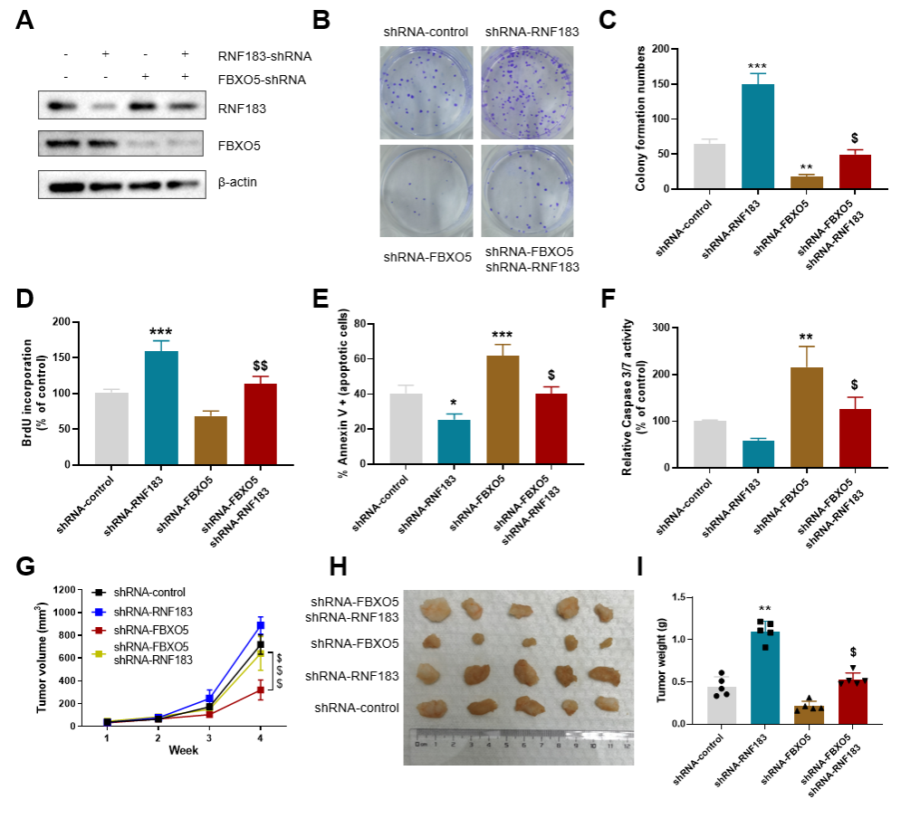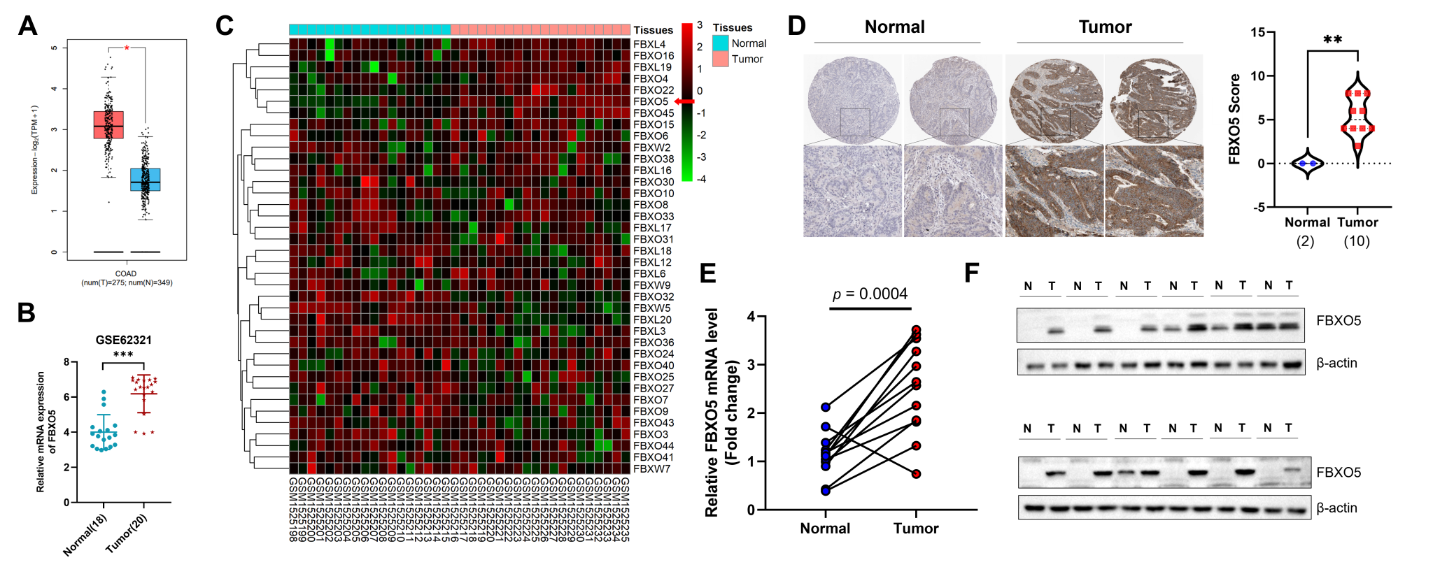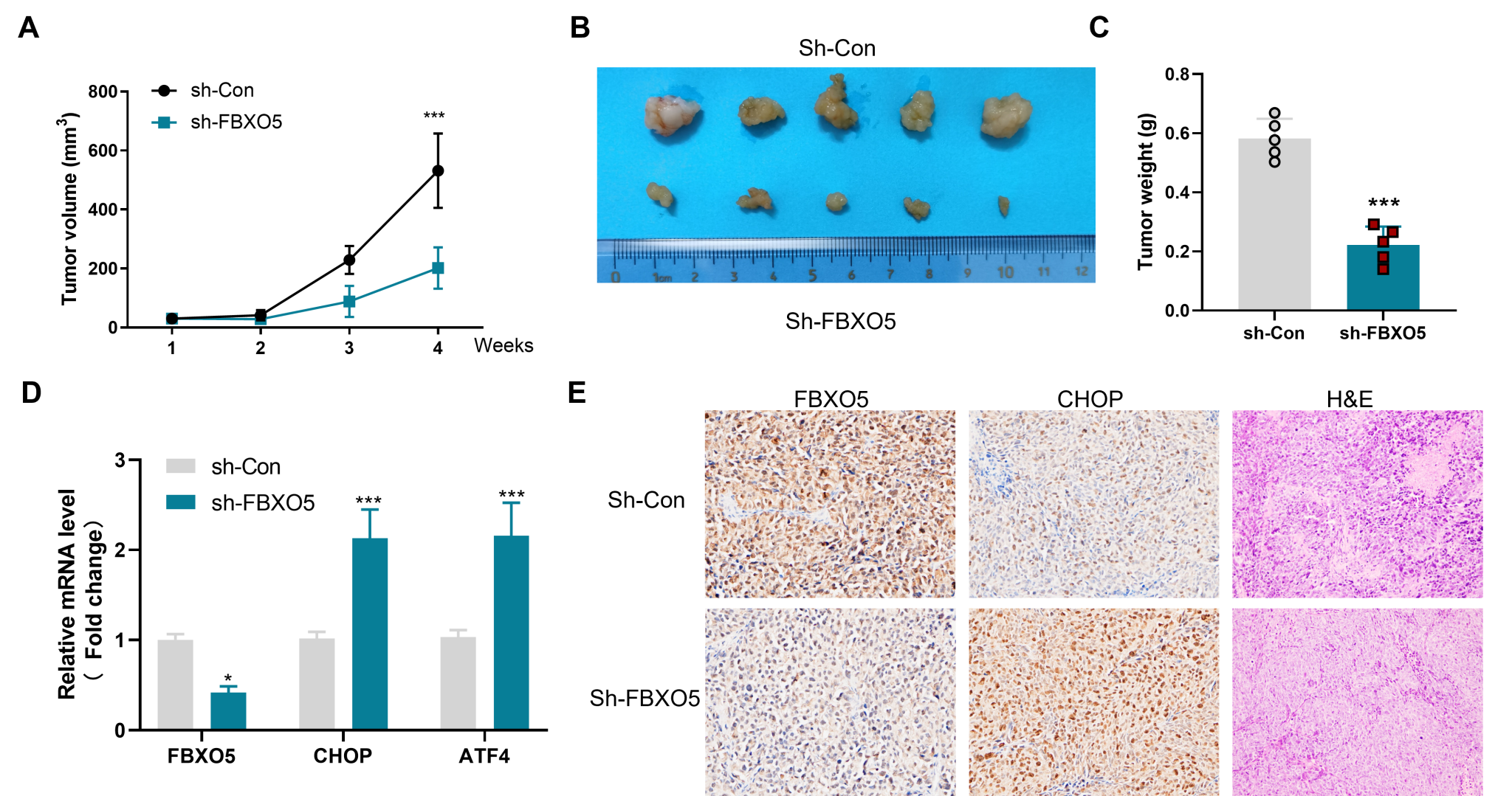 研究团队通过裸鼠成瘤实验、H&E染色和临床病人样本免疫印迹等实验,发现FBXO5在人类结肠癌中高表达,是结肠癌预后不良的重要指标,干扰FBXO5的基因表达能够促进由内质网应激诱导的细胞凋亡,抑制肿瘤细胞生长,表明FBXO5是一个结肠癌治疗的重要新靶点。