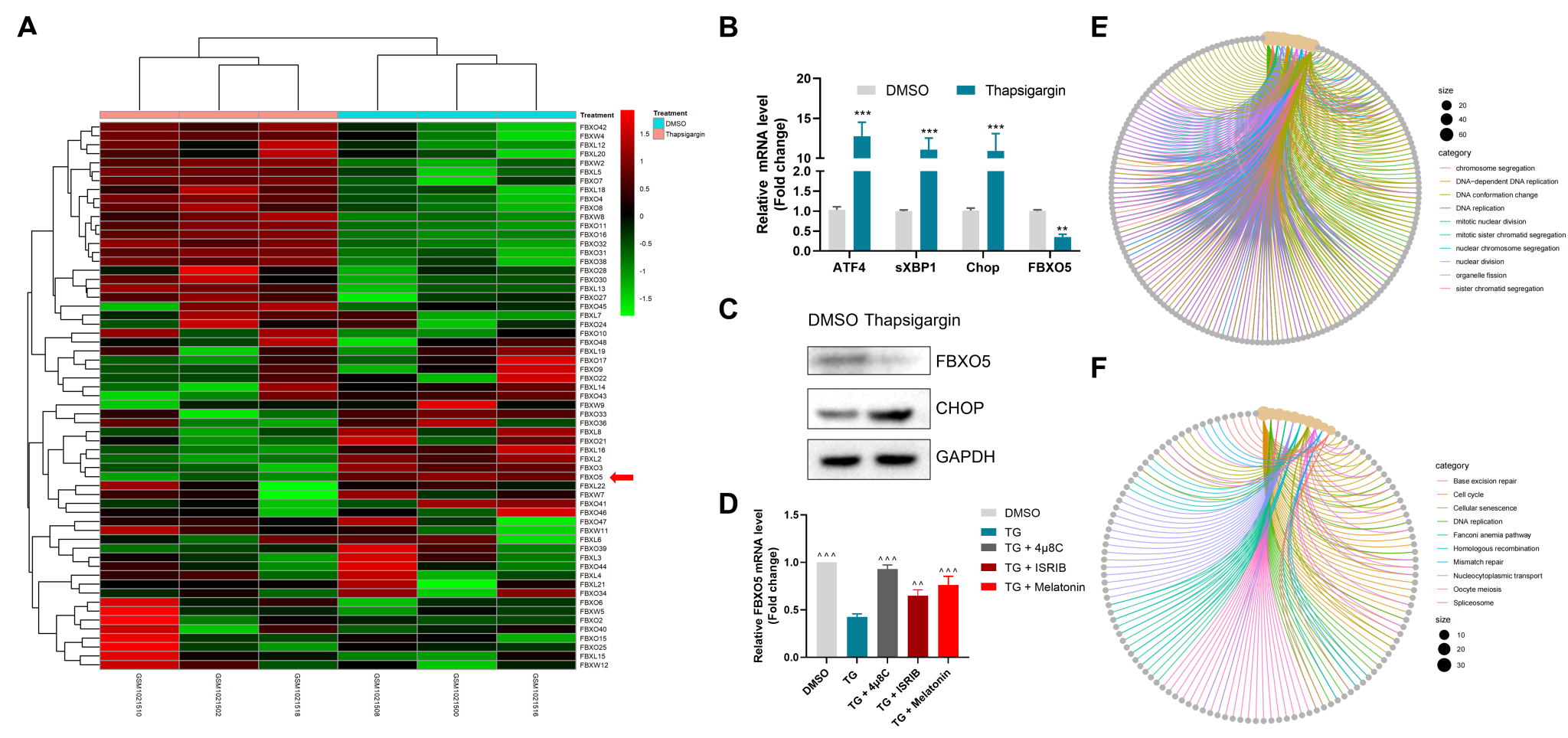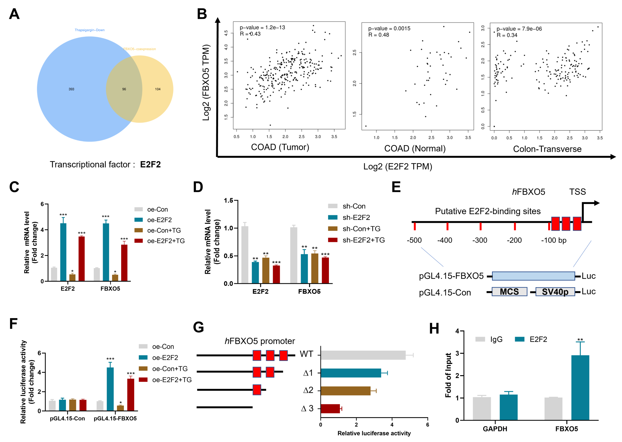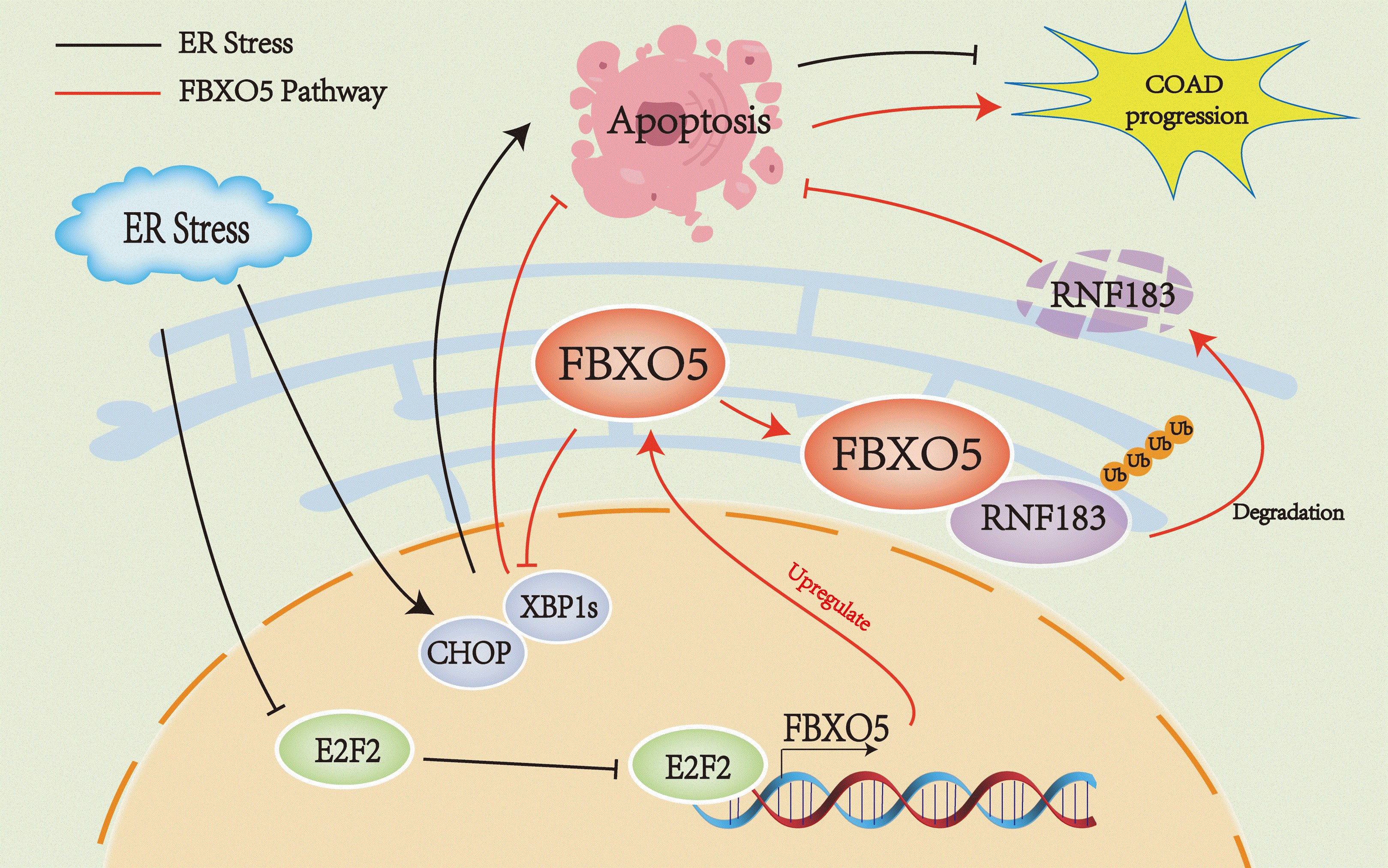 F-box家族蛋白在细胞周期调控中起着重要的作用,该团队进一步通过生物信息学、荧光素酶报告实验、染色质免疫沉淀、蛋白免疫印迹等实验方法,分析F-box家族蛋白在结肠癌细胞中与内质网应激的关系,首次发现内质网应激通过抑制E2F2选择性下调FBXO5的转录表达,FBXO5通过PERK/IRE1α/ATF6信号通路参与内质网应激介导的细胞周期。