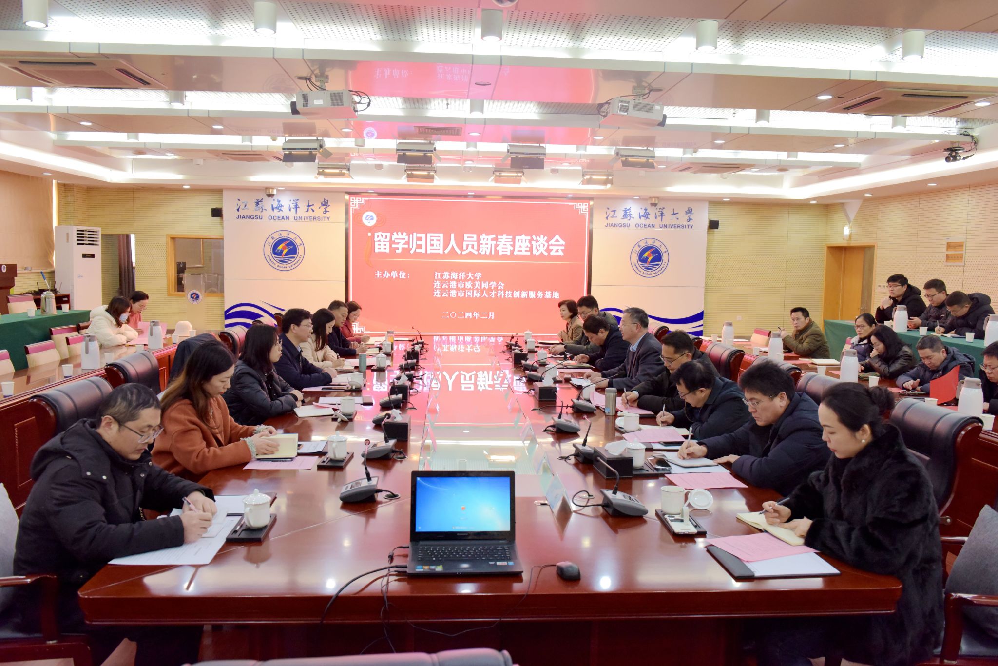 2月26日上午,我校与连云港欧美同学会、连云港市国际人才科技创新服务基地共同主办留学归国人员新春座谈会。市委“两新”工委副书记、市委人才办副主任肖双、市人社局党组成员、副局长张建慧、市科协副主席禇士明以及市委统战部、市侨办、市科技局、市工信局相关负责人出席座谈会。校长宁晓明、副校长申欣出席座谈会,党委统战部、人事处、科学技术处、大学科技园、国际交流与合作处相关负责人以及我校留学归国教师代表参加座谈会。座谈会由副校长申欣主持。