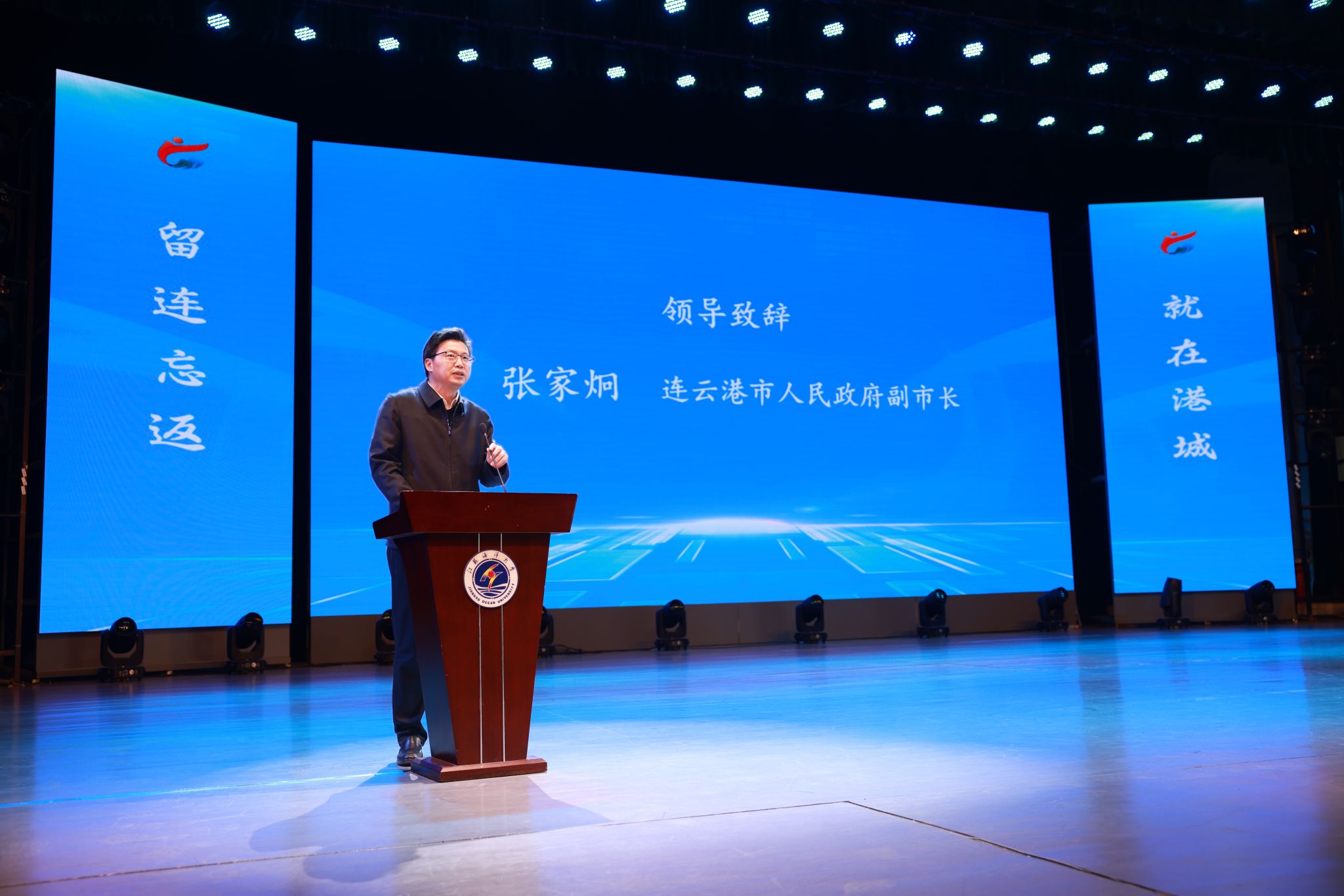 张家炯致辞,他代表市委、市政府,向出席活动的来宾及学生表示热烈的欢迎,向关心支持连云港发展的在连高校表示衷心的感谢。他希望以本次推介宣讲活动为起点,让更多在连高校大学生了解港城经济社会发展,增强港城归属感,最终选择港城、扎根港城。他希望同学们矢志奋斗,在人文底蕴深厚的港城成长成才;积极融入港城,始终与港城的发展同频共振;选择港城,一起来做现代化新港城的合伙人。