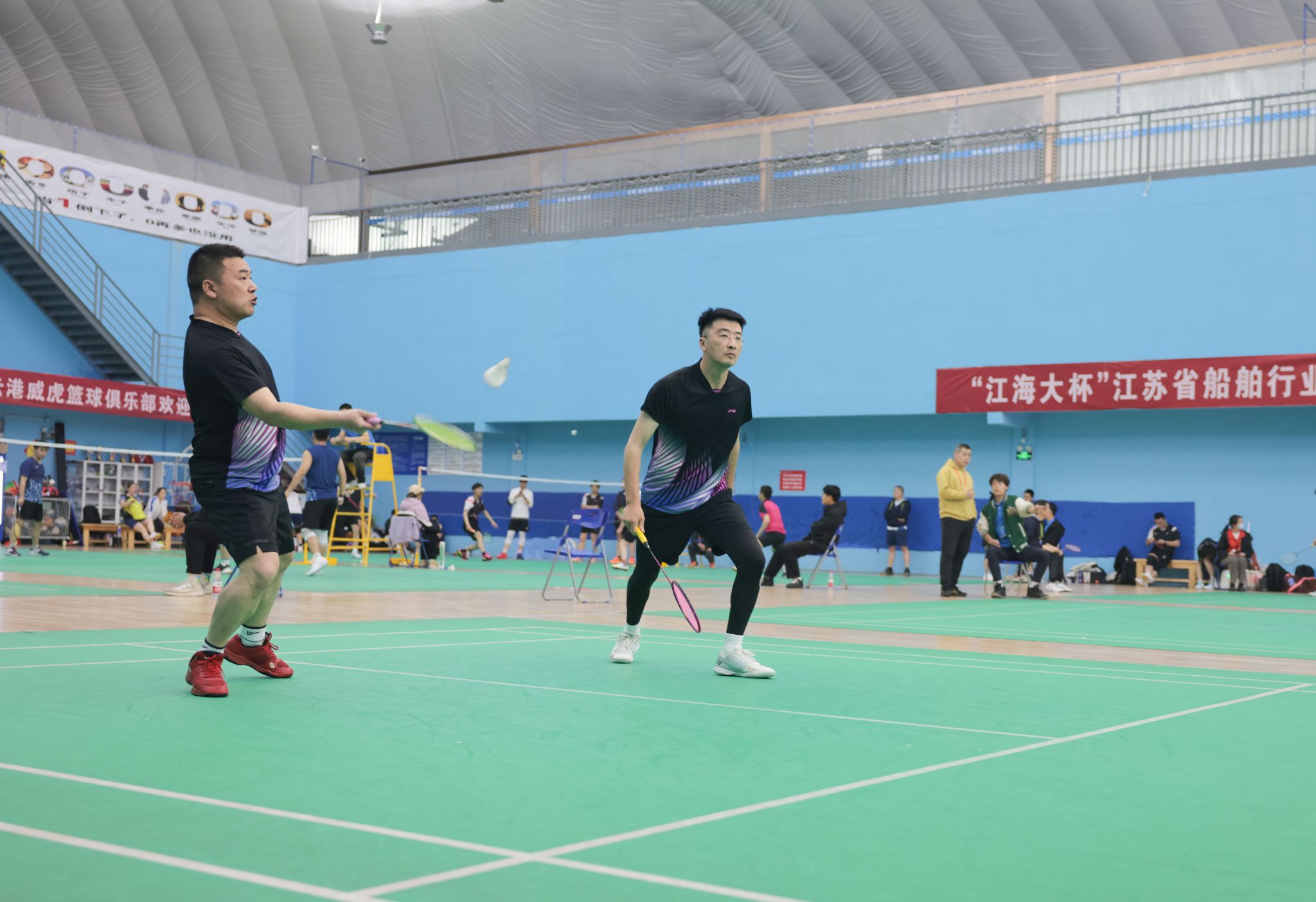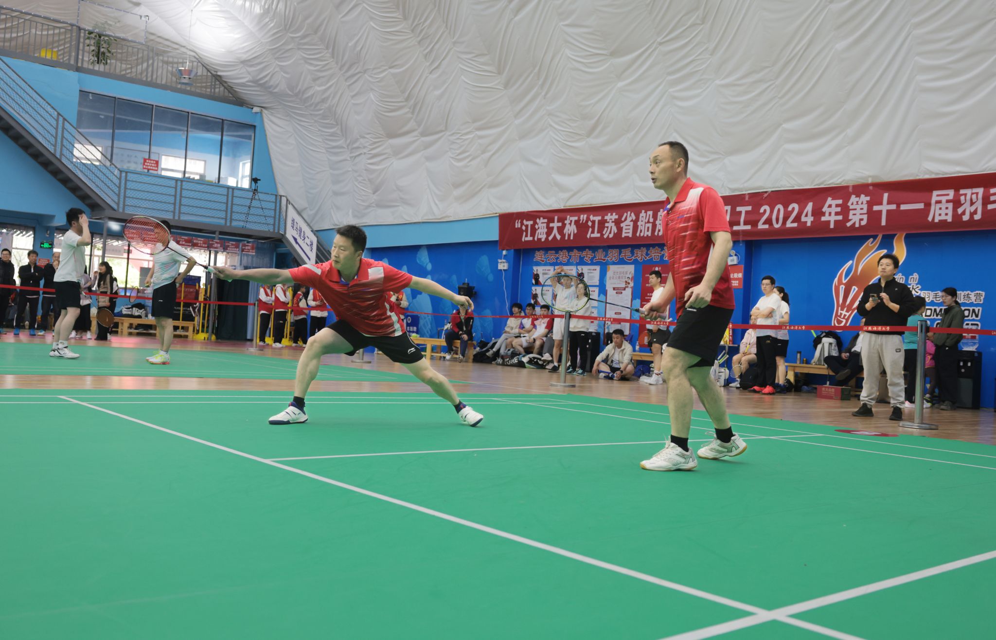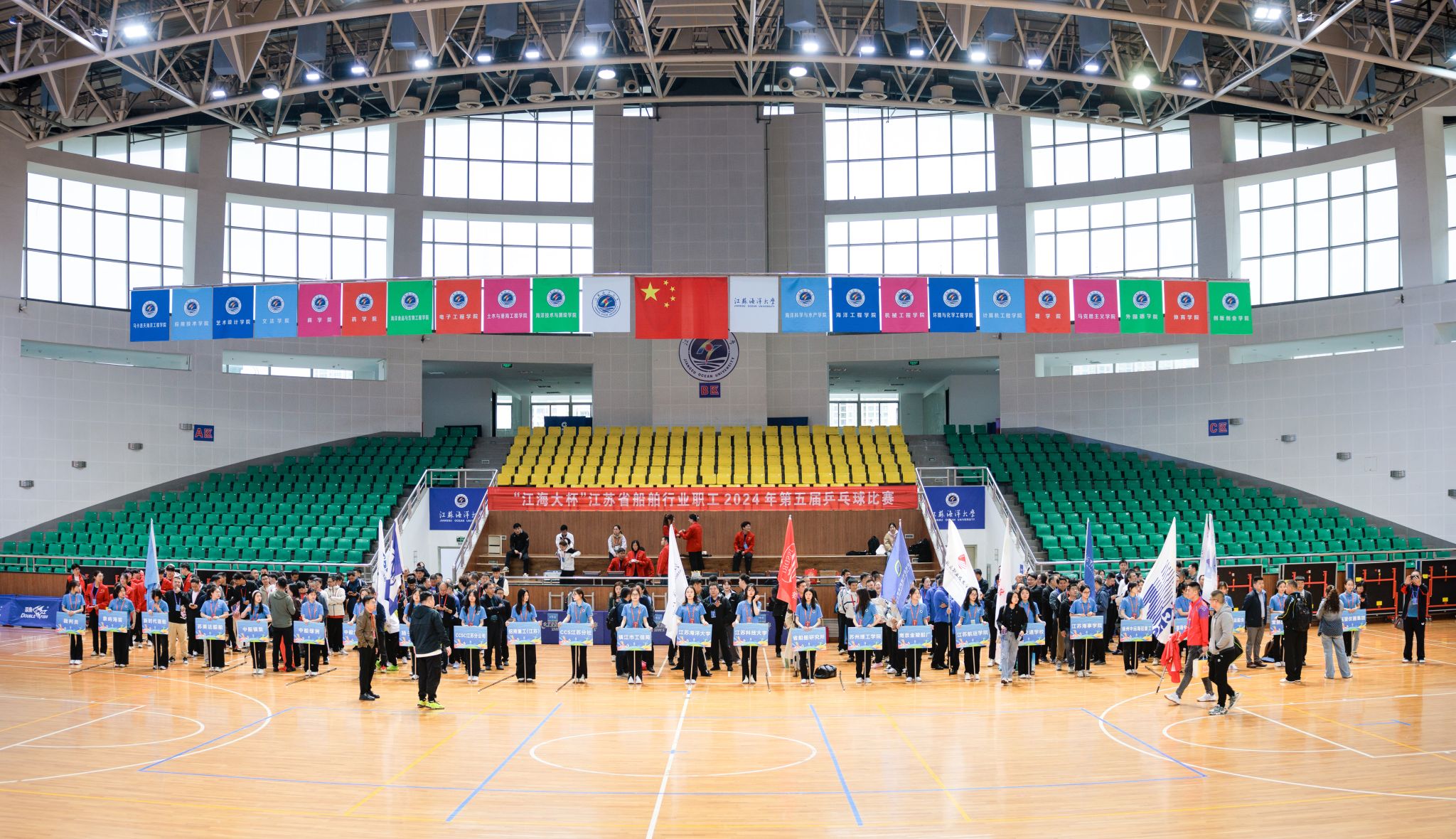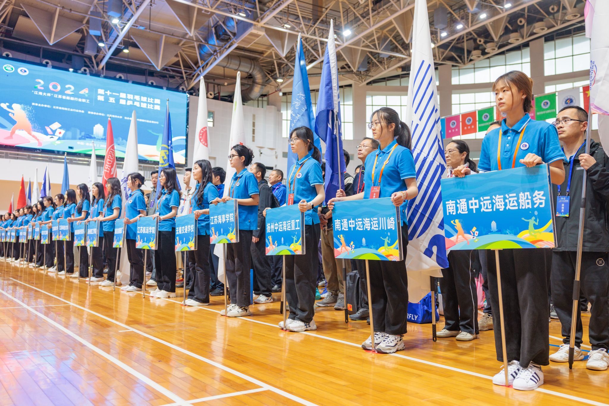 4月20日上午,江苏海洋大学体育馆内彩旗飘扬,气氛热烈,“江海大杯”江苏省船舶行业职工第十一届羽毛球比赛、第五届乒乓球比赛在这里隆重开幕。来自全省船舶行业25个企事业单位的300余名运动员再次相聚,共同奏响运动与团结的乐章。