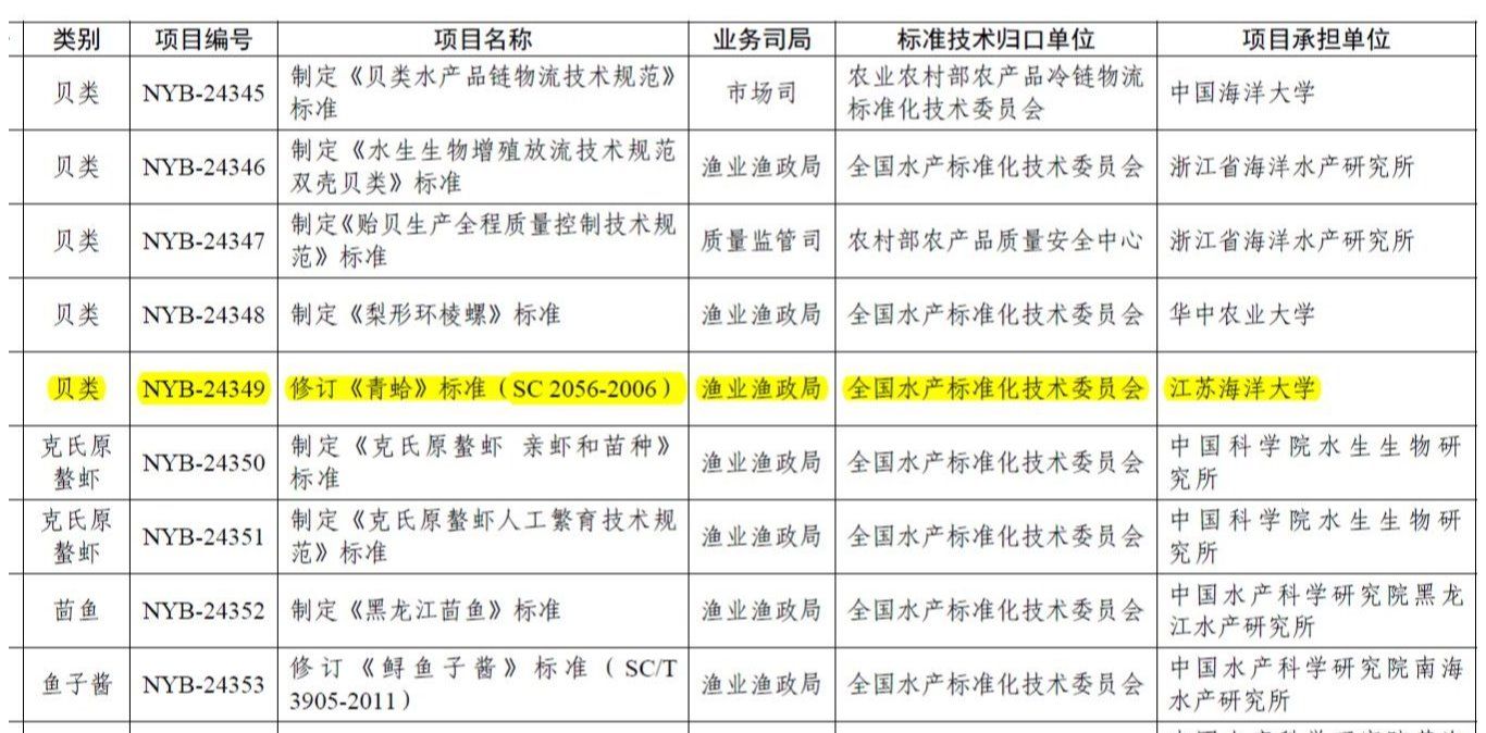 国家农业行业标准是中国标准体系的重要组成部分,对于推进现代农业高质量发展,助力乡村振兴有着重要意义。“修订《青蛤》标准(SC 2056-2006)”(NYB-24349)获批立项是我校在坚持“四个面向”,深化“向海”转型,深耕海洋领域科技创新与社会服务的又一次务实举措。我校将按照农业农村部的相关要求,认真组织落实,确保标准修订高质量、按期完成,在深耕“蓝色粮仓”等海洋领域科技创新,服务海洋强国建设和区域地方经济发展中贡献江海大的智慧和力量。