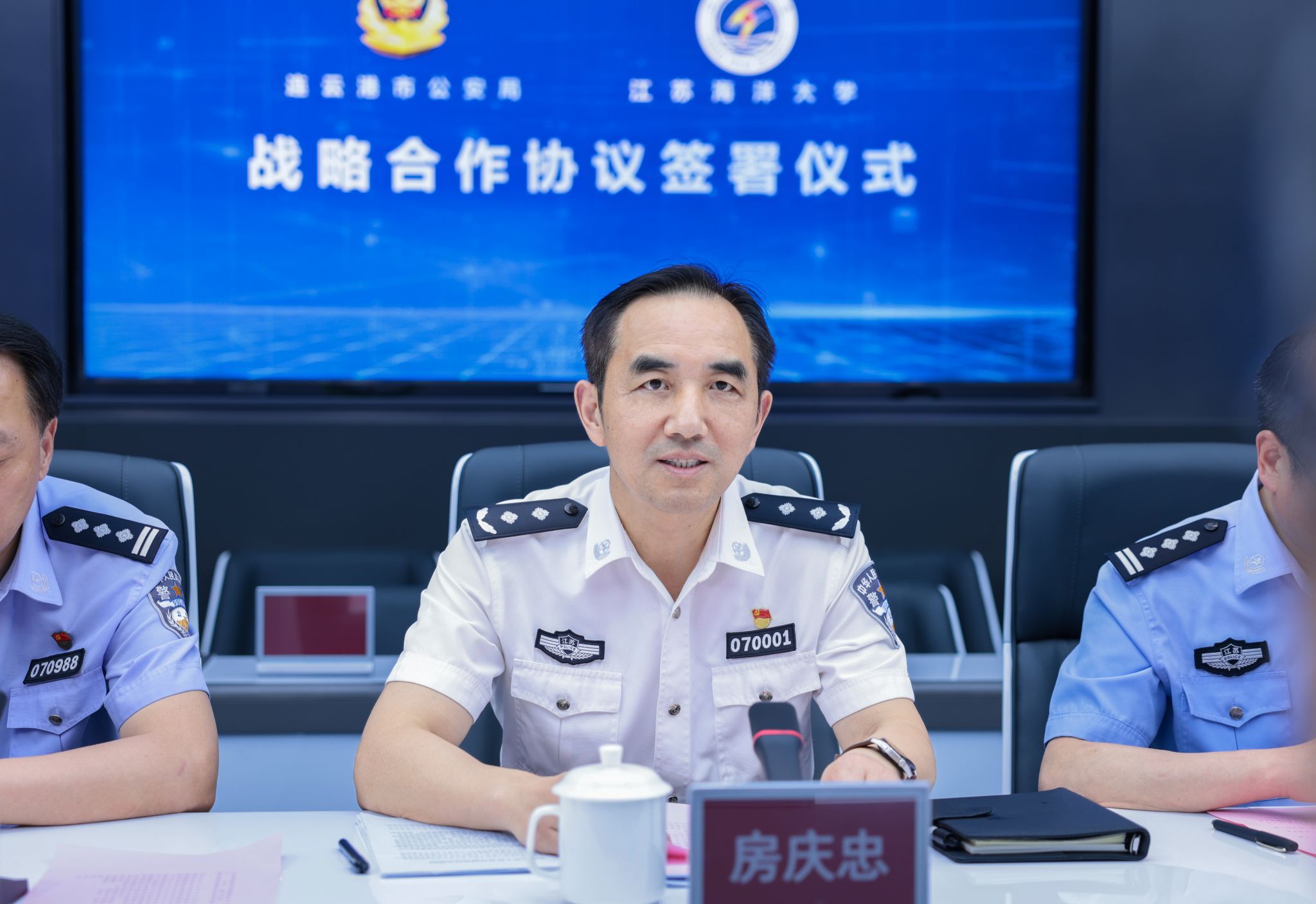 为进一步加强我校与连云港市公安局的合作,提升科学研究水平,创新人才培养模式,提高学校服务地方经济社会发展能力,7月4日,我校与连云港市公安局举办战略合作协议签约仪式。校党委书记许峰,连云港市副市长、市公安局局长、党委书记房庆忠,副校长朱国军,副校长郑利军出席签约仪式。