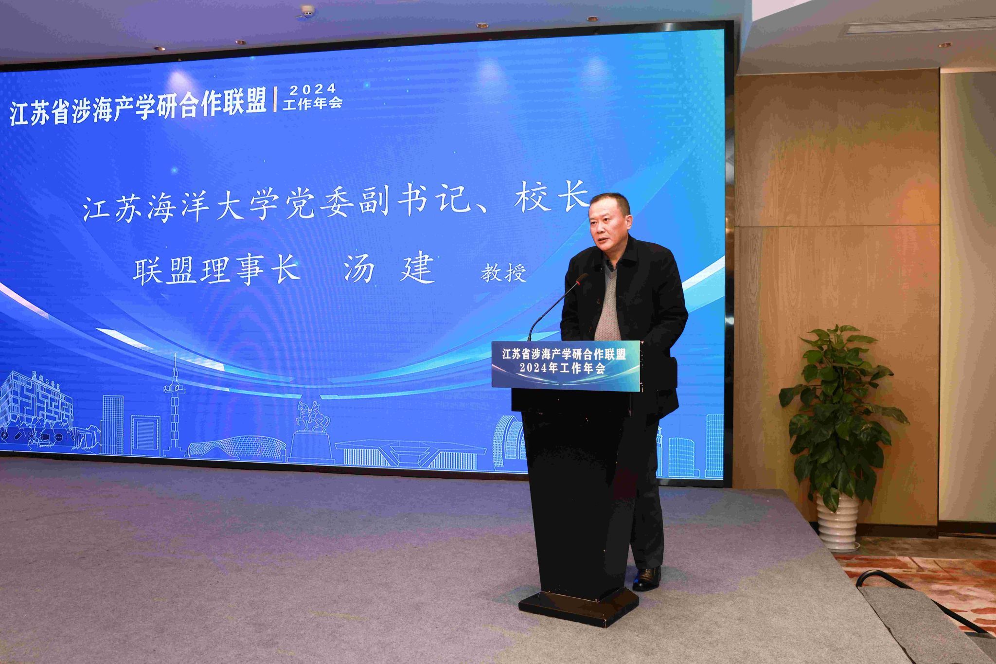 新任联盟理事长汤建在致辞中介绍了联盟成立一年多来在深化政产学研对接、涉海科技成果推介、涉海合作活动交流、涉海创新基地建设、知识产权培训服务等方面取得的成效,展望了联盟的未来发展。他表示,江苏海洋大学将和各理事单位一道,坚持“四个面向”,统筹推进教育科技人才一体发展,持续打造特色办学新优势,深化科技创新资源对接,围绕涉海关键核心技术突破开展联合攻关,协同创“新”,提“质”共进,着力提升联盟服务力、扩大联盟“朋友圈”,把联盟建设成为服务江苏海洋新质生产力发展的重要阵地,为推动江苏海洋产业高质量发展提供更加有力支撑。