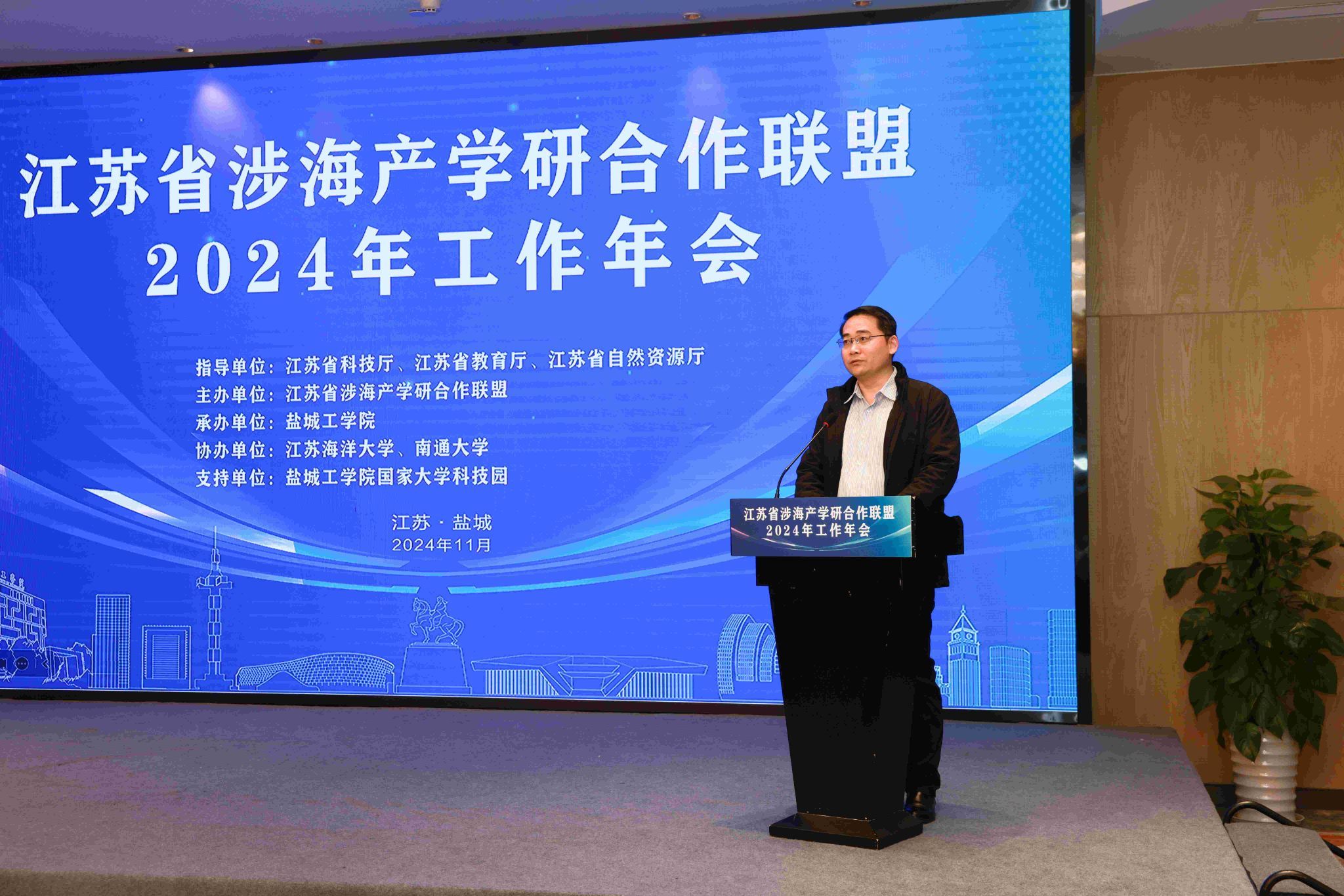 本次年会由江苏省涉海产学研合作联盟主办,由盐城工学院承办,江苏海洋大学、南通大学共同协办。江苏省生产力促进中心、沿海三市科学技术局相关负责人,以及来自全省涉海领域相关高校、科研机构和企业等36家联盟成员单位代表近百人参加会议。