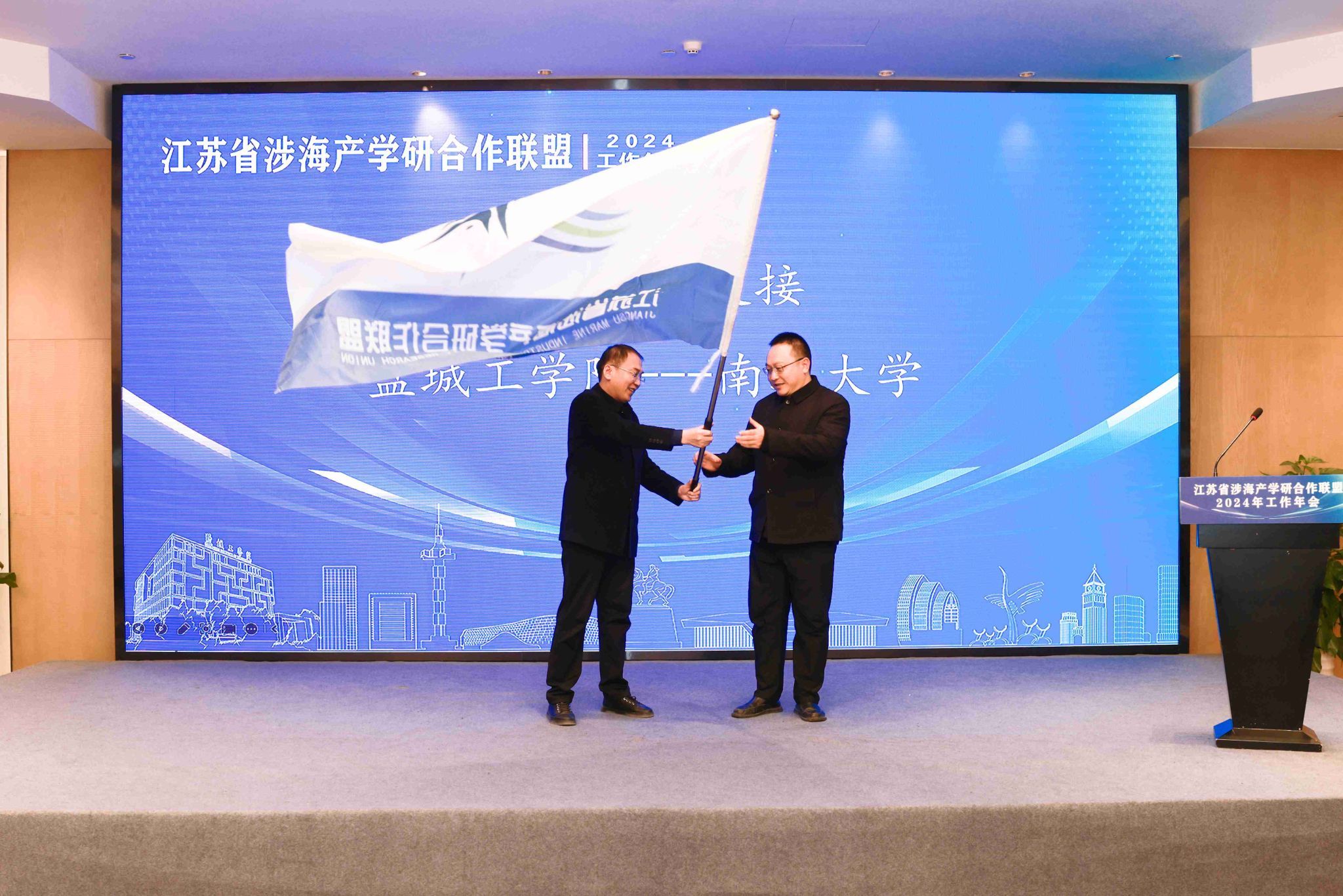 11月29日下午,江苏省涉海产学研合作联盟2024年工作年会在盐城召开。江苏海洋大学校长汤建、盐城工学院校长邵荣、江苏省科技厅区域创新与成果转化处副处长祝永坚,江苏省自然资源厅海洋规划与经济处三级调研员刘军强出席年会并致辞。江苏海洋大学原校长宁晓明在理事会上致辞。南通大学副校长华亮,江苏科技大学副校长周宏根出席。江苏海洋大学副校长申欣主持理事会。盐城工学院副校长丁成主持年会。