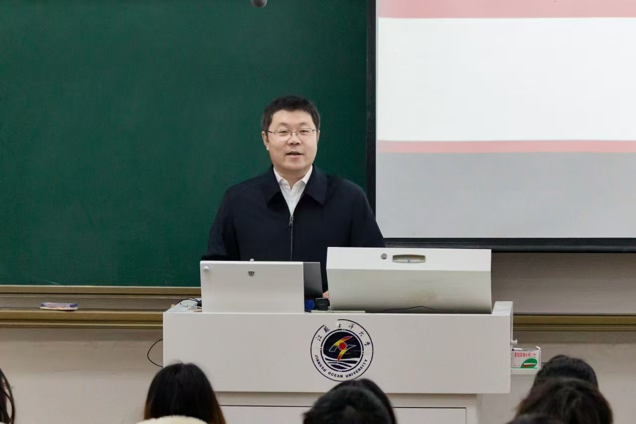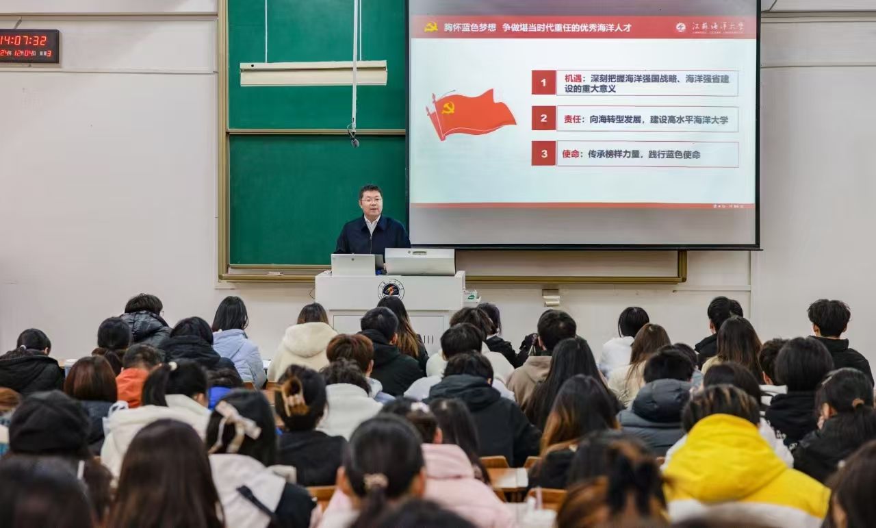 校党委书记许峰以“胸怀蓝色梦想争做堪当时代重任的优秀海洋人才”为题,为学生们讲授了一堂“海味十足”的思政课。许峰结合党的十八大以来,我国海洋事业取得的重大成就,通过大量的数据和丰富的案例,阐述了实施海洋强国战略的历史必然和现实意义,解读了江苏省委省政府加快建设海洋强省的重点谋划和决策部署。许峰还结合校史校情,向同学们介绍了学校深化向海转型建设,建设高水平海洋大学的办学目标,以及我校在专业布局、学科建设、科研成果转化、人才队伍、校园文化建设、国际交流与合作等方面取得的阶段性成就。
