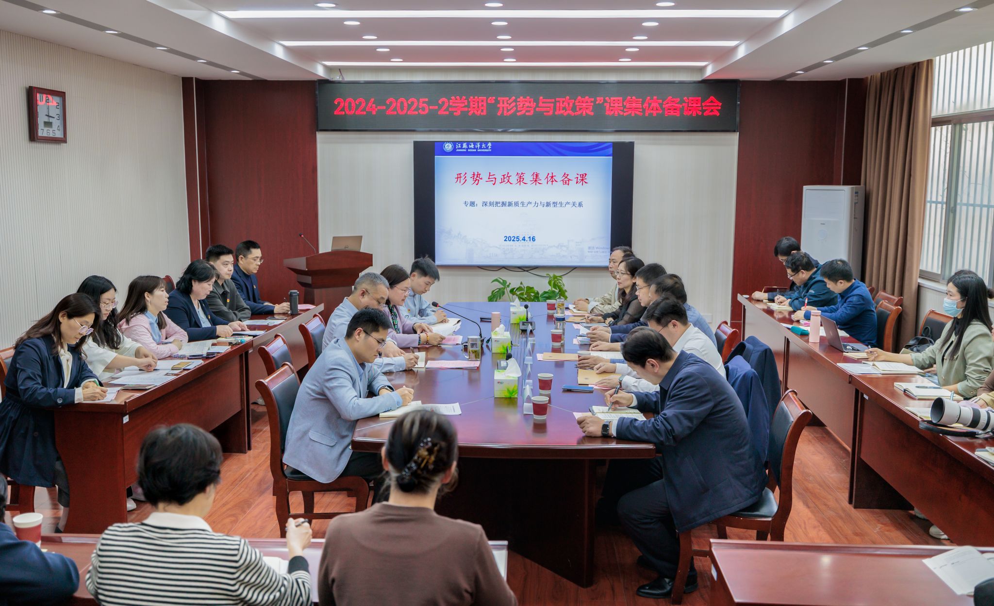 为深入学习贯彻党的二十届三中全会和全国“两会”精神,将党的创新理论融入“形势与政策”课程教学,4月16日下午,我校在文渊楼112会议室召开2025年春季学期“形势与政策”课集体备课会。校党委书记许峰,校长汤建,副校长金芙蓉、马廷淮,校党委常委王波、毛宝海出席备课会。