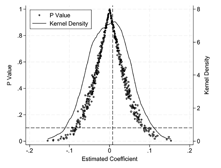 为验证基准回归结果可靠性,文章作者们对该发现进行了一系列稳健性检验。通过500次随机抽样构建“伪实验组”开展安慰剂检验,政策自身因素外的其他因素对实验结果影响被排除,其结果呈正态分布充分说明“宽带中国”政策对城乡收入差距的扩大效应并非偶然。此外,后续还进一步通过政策冲击、PSM-DI等对稳健性进行了检验,结果仍支持原假设。