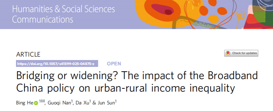 近日,商学院国际商务专业硕士生导师何兵博士与其指导的2022级研究生南国淇、徐达,以及孙军教授合作,以江苏海洋大学为论文第一完成单位和唯一通讯单位,在Nature旗下唯一面向人文与社会科学的期刊Humanities & Social Sciences Communications(《人文与社会科学通讯》)发表高水平文章“Bridging or widening? The impact of the Broadband China policy on urban-rural income inequality”。研究发现,宽带中国政策在推动城乡收入增长的同时短期内加剧了收入差距,但这一效应会因多政策协同有所减弱,这一发现为以数字经济为代表的新业态健康发展提供了重要理论依据。商学院何兵为第一作者兼通讯作者,2022级国际商务专业研究生南国淇、徐达和孙军教授为合作作者。