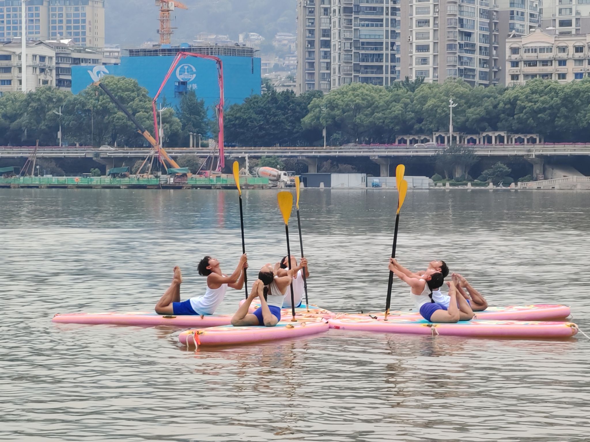 比赛中,我校桨板瑜伽队凭借扎实的技术水平展示及精彩的动作编排,充分展现出了精湛的竞技水平及体育风采。夜晚的太鹤湖云雾缭绕,队员们克服了风雨天气的影响,在桨板上做出倒立、劈叉、起腿等一个个高难度瑜伽动作,尽情展示力与美。
